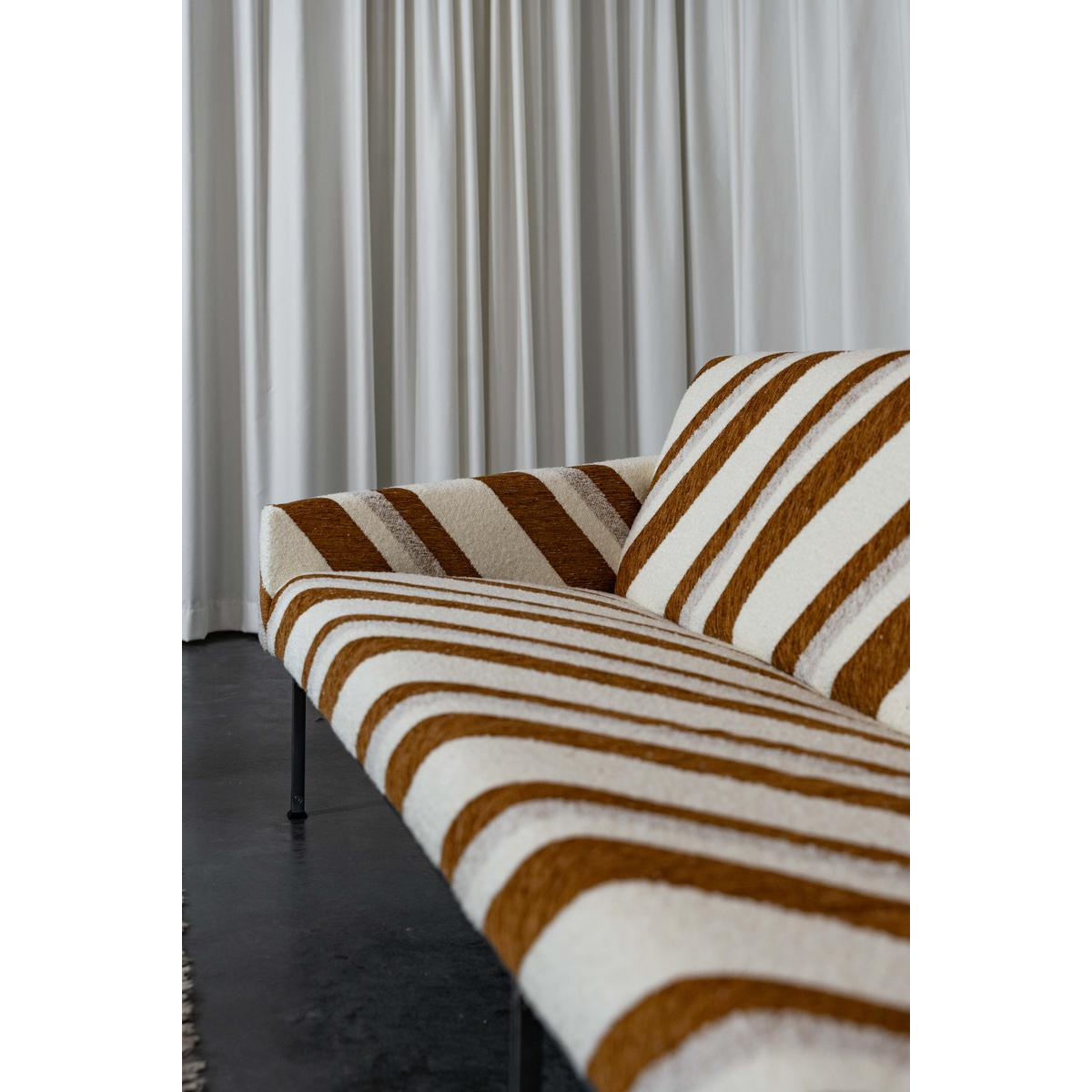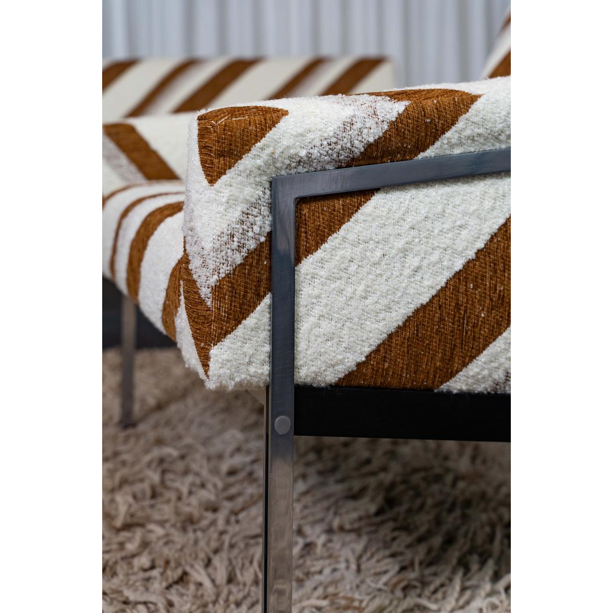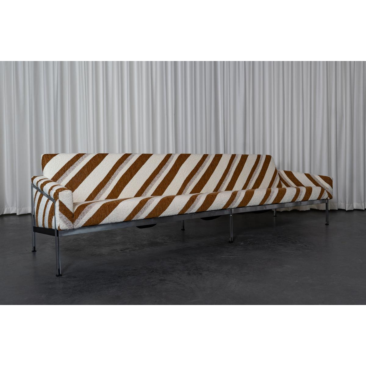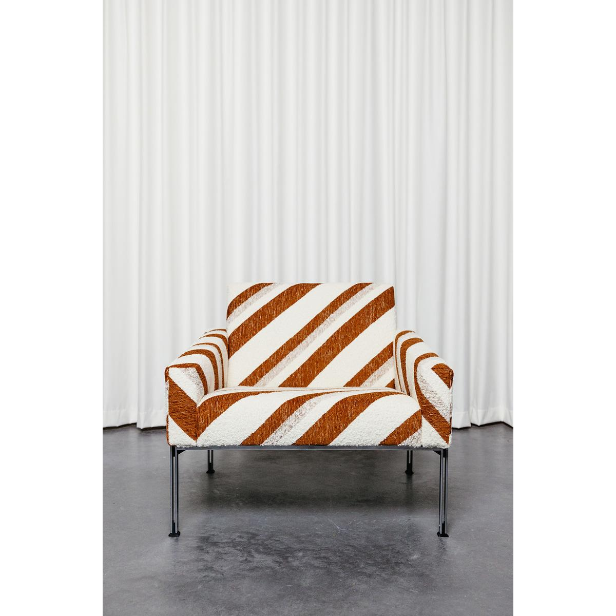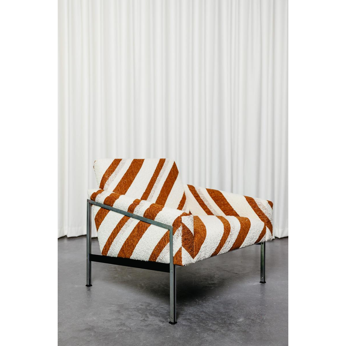 Sofa and armchair by Wolfgang Herren for Lübke, Germany, 1960. This sofa and armchair set on a thin metal base has been completely reupholstered and covered in a striped jacquard fabric from Casamance.