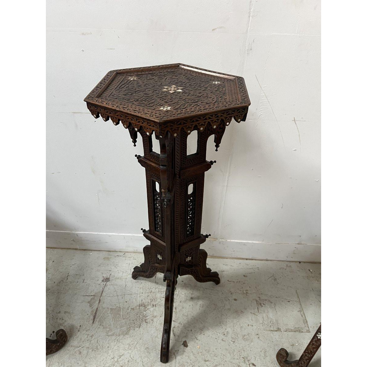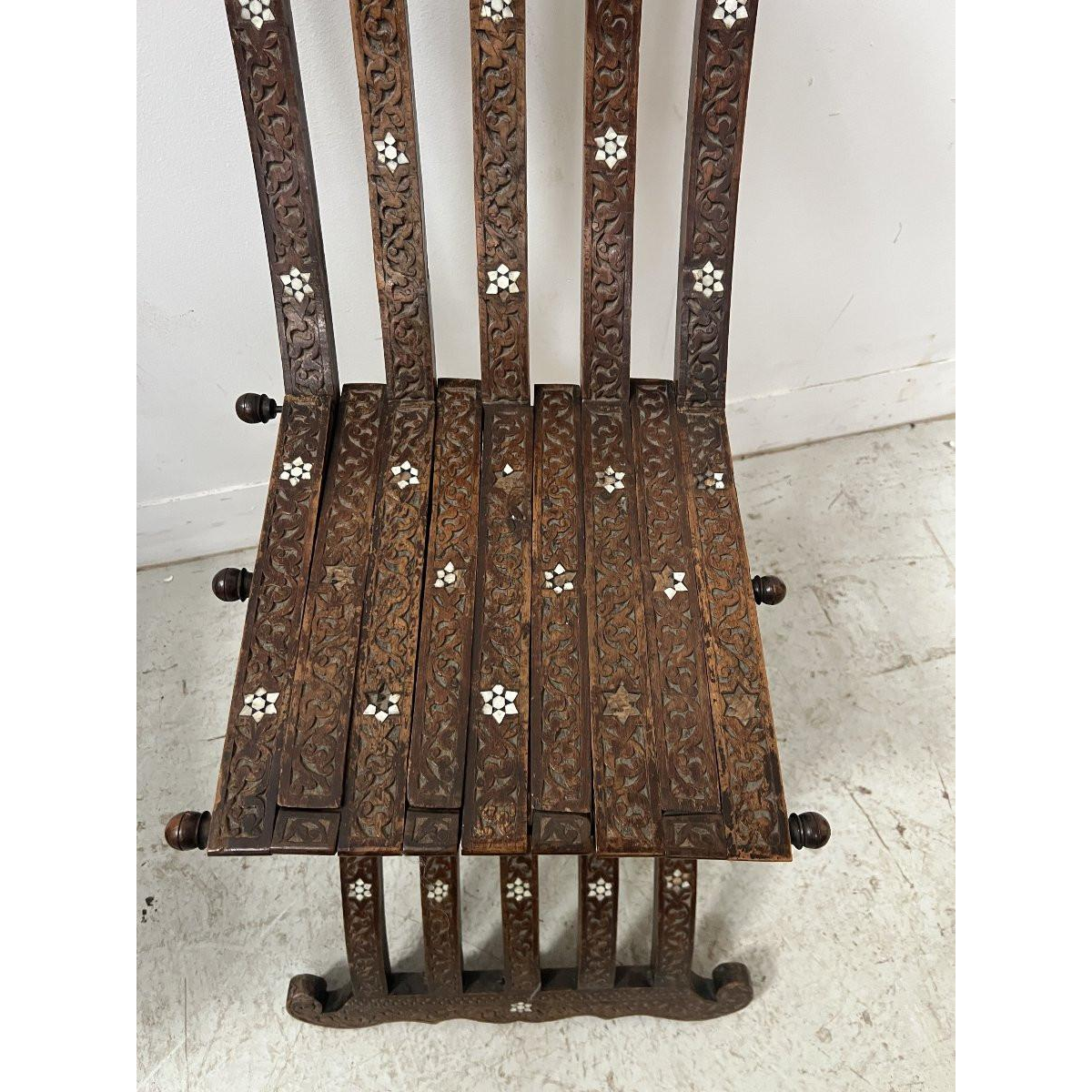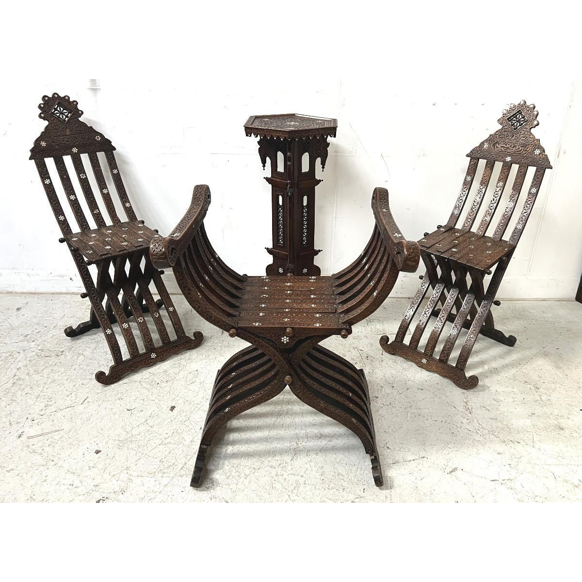Set consisting of two folding chairs carved and inlaid with mother-of-pearl stars, a folding curule chair, a carved wooden pedestal inlaid with mother-of-pearl.
