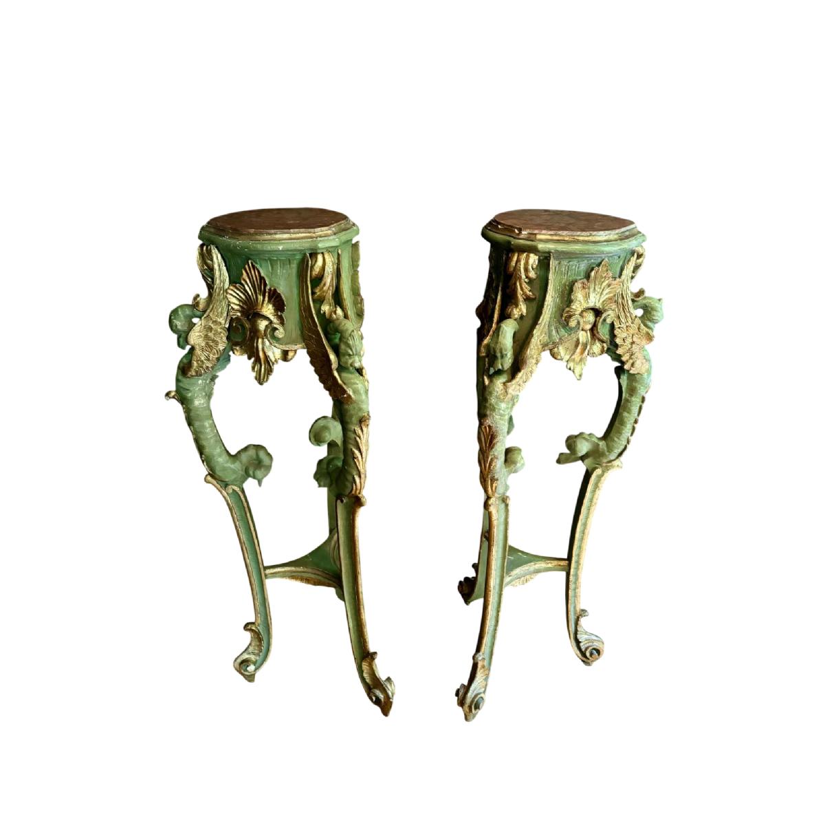 Spectacular and elegant pair of Italian sellettes in carved wood, polychrome green and gilded.