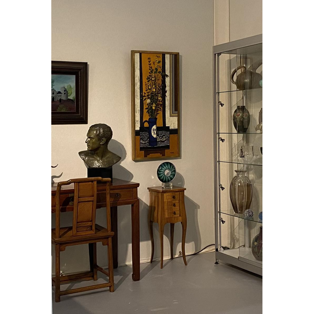 Tableau représentant un bouquet de fleurs dans un pot bleu, posé sur une table noire, sur fond ocre. Le tableau est tout en hauteur, ce qui est accentué par les tiges florales.