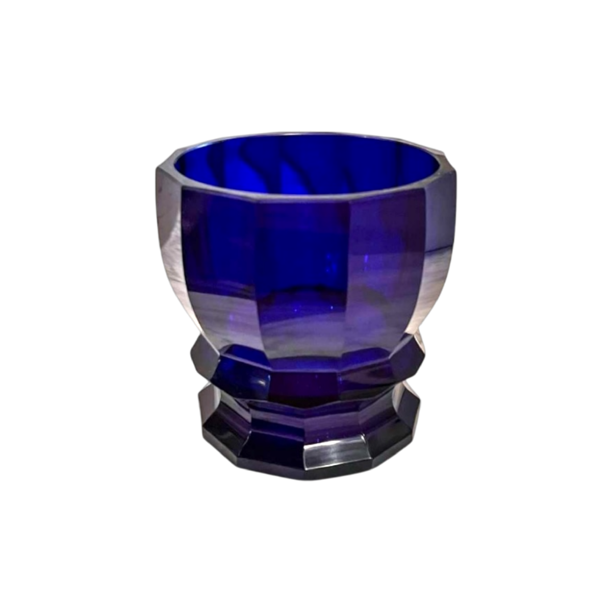 Vase in cobalt-blue crystal of great purity, cut with remarkable precision into geometric facets.