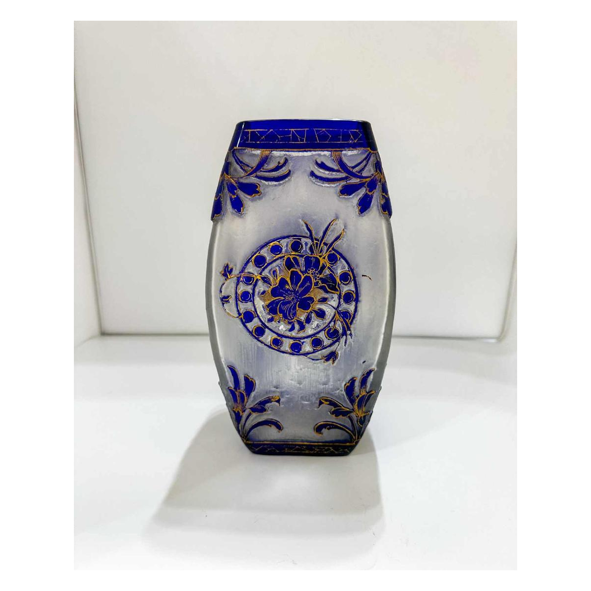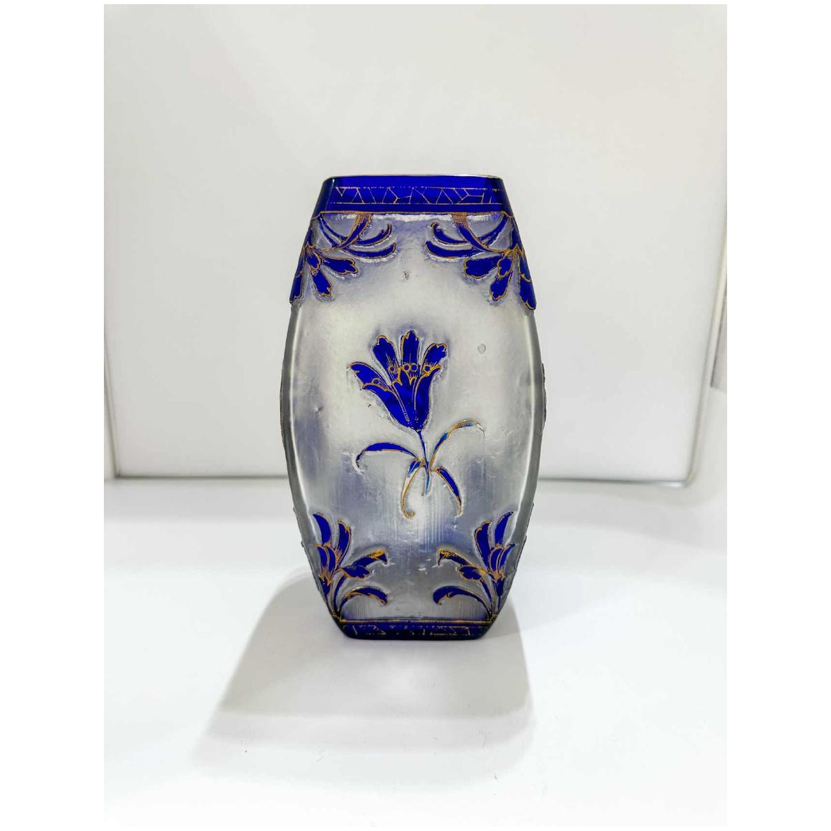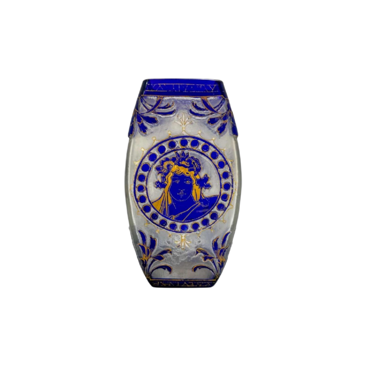 Ludwig Moser Art Nouveau vase dating from 1890-1900, with a beautiful feminine motif in the style of Alphonse Mucha; beautiful blue and gold colors; plant decoration on the other three sides of the vase.
