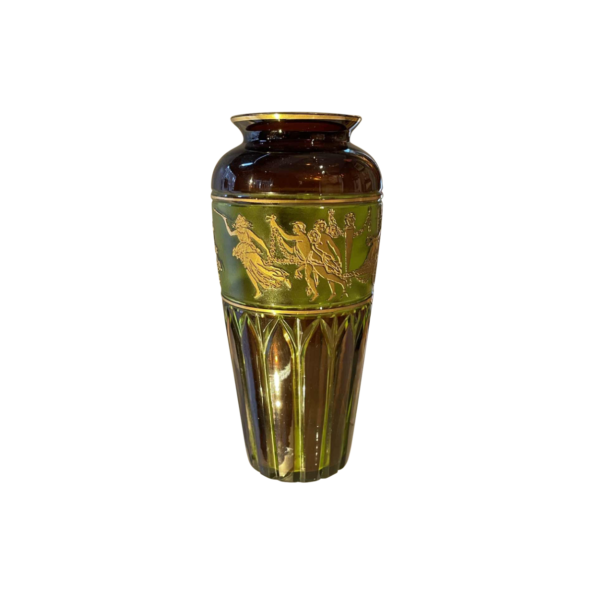 Pistachio-coloured cut crystal vase lined with plum decorated with the Dance of Flora acid-etched and gilded. Signature Val St Lambert written in gold below. Vintage certified vase and Léon Ledru creation