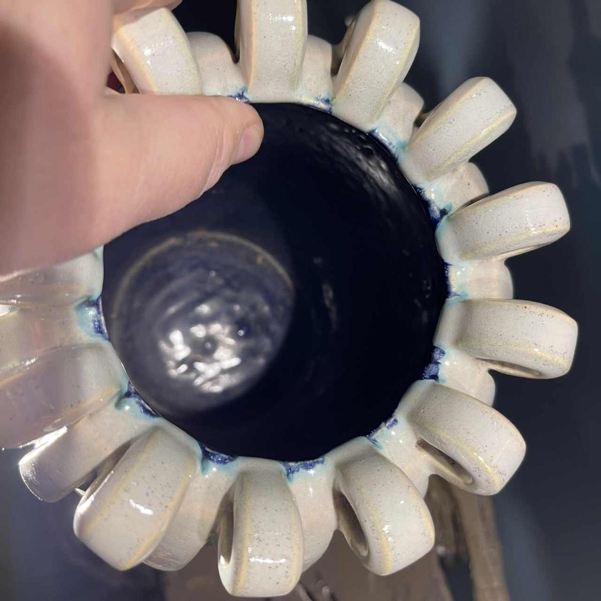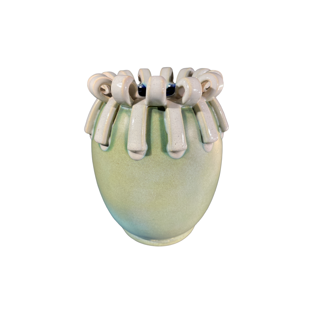 Ovoid vase with a wide scalloped neck in stoneware glazed in mat green and smooth white, glazed in smooth blue inside.