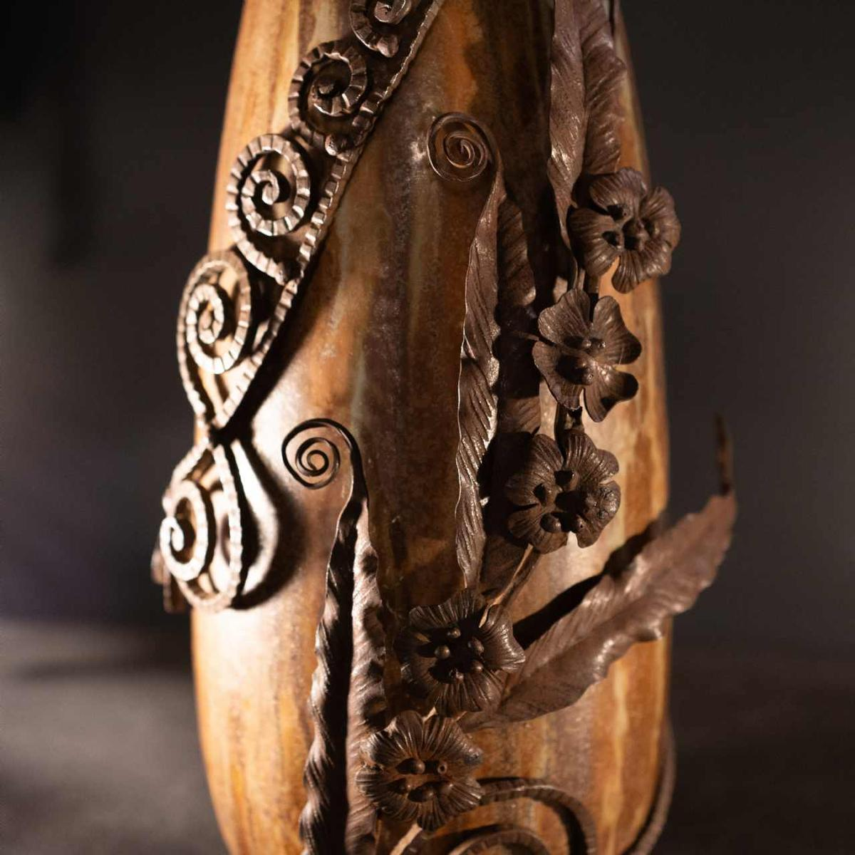 It is adorned with a wrought-iron frame by François Carion, a Belgian ironworker who also created frames for Schneider glass vases in France.