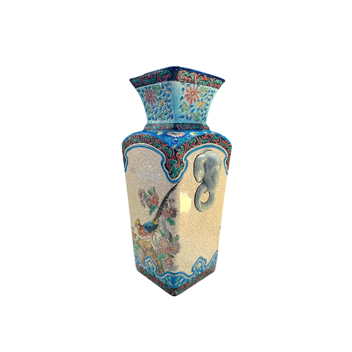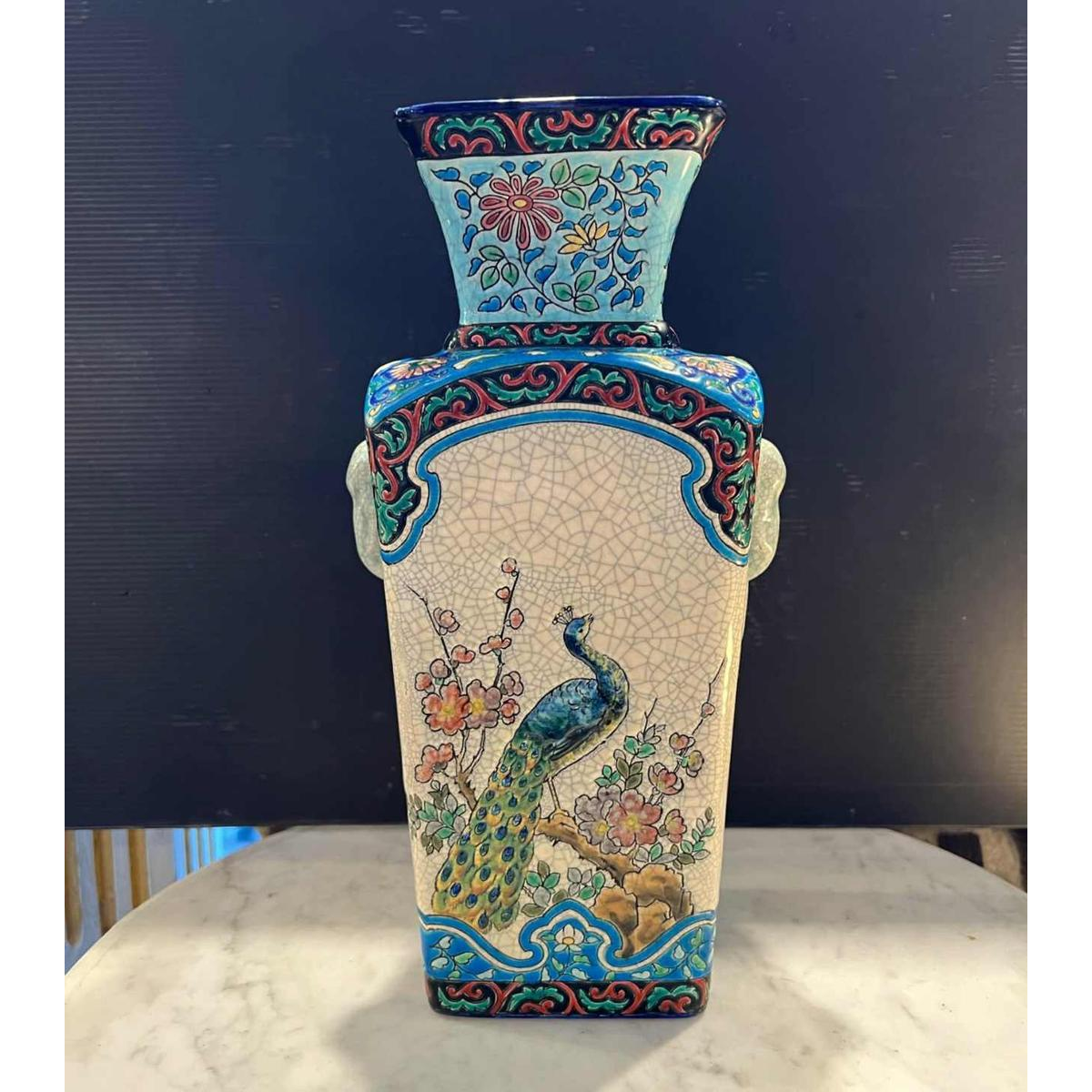 LONGWY earthenware quadrangular vase based on a traditional Chinese prismatic form, richly decorated with relief enamels on a crackled white ground depicting flowering branches and a peacock, the upper part and heel decorated with frieze and flowers.