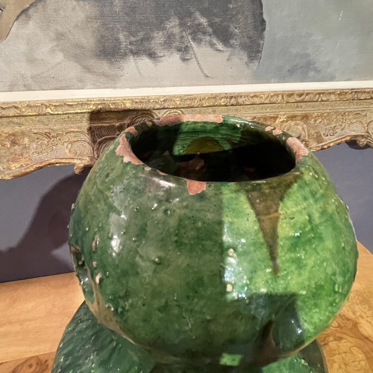 Large baluster vase with recesses in glazed stoneware, large green enamel pours.