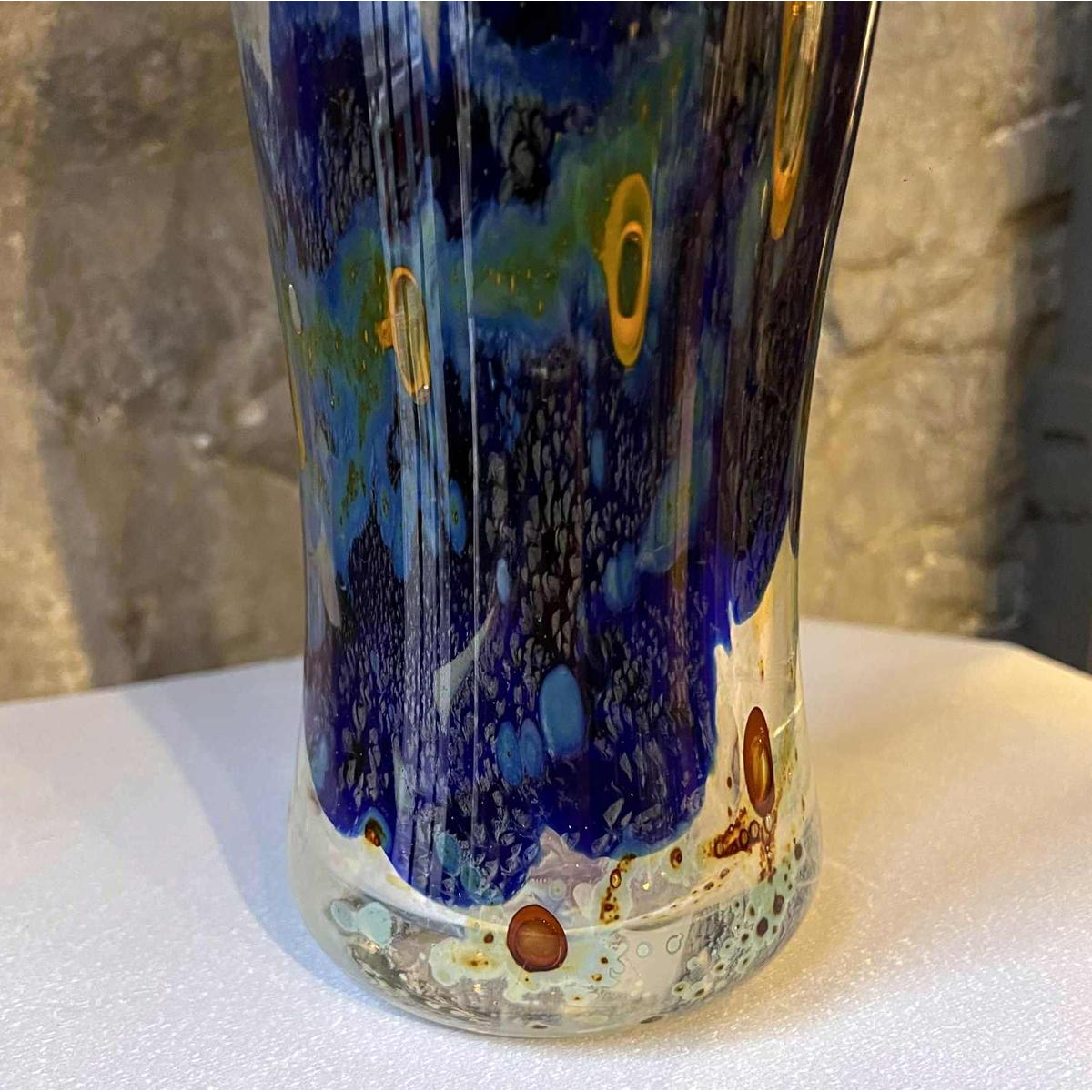 Decorated with metallic oxides on a clear transparent background of crystal, cobalt blue and green/grey.