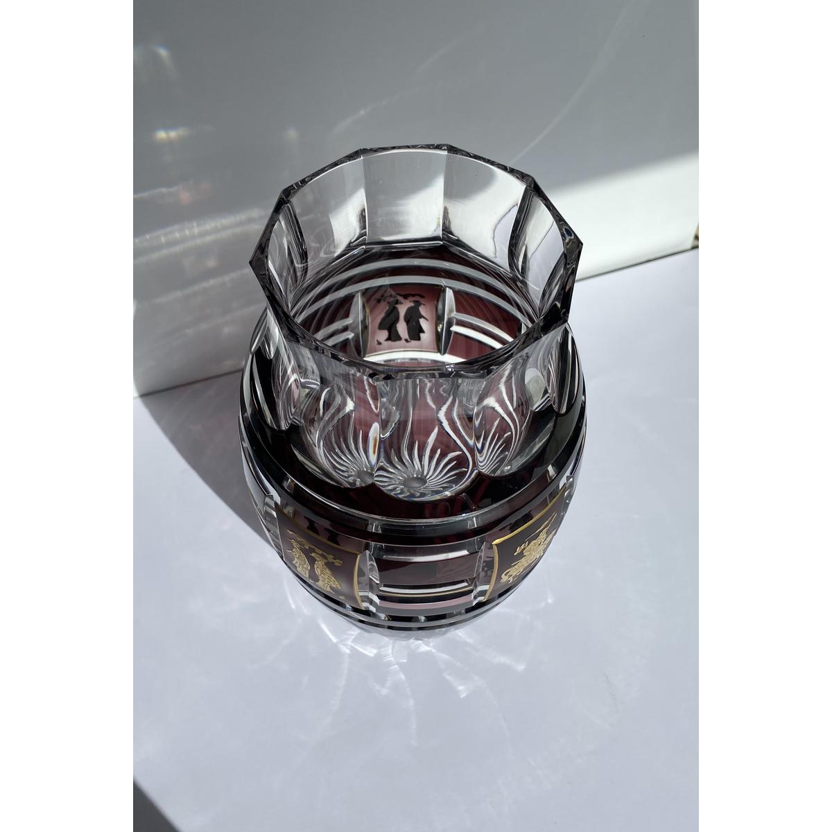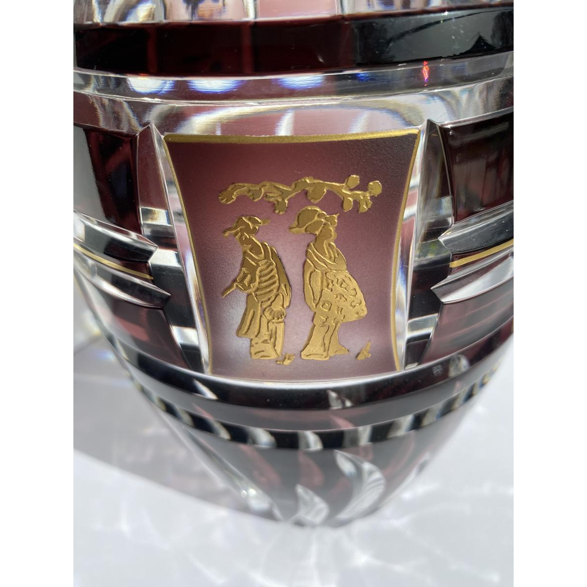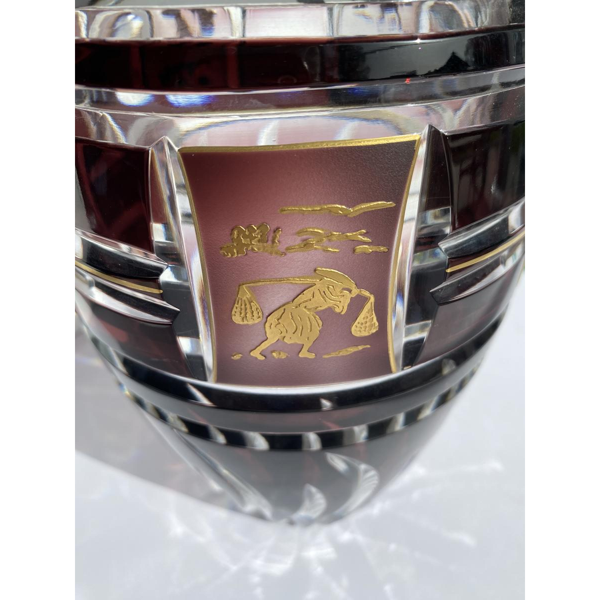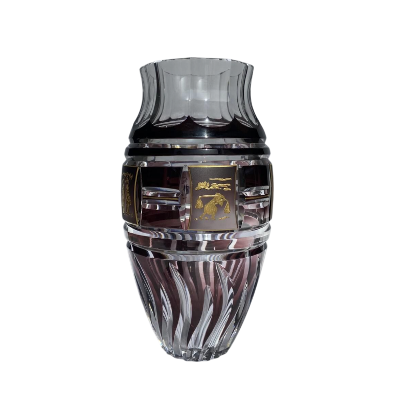 Vase 30 cm high, in colorless crystal, lined with plum, cut and decorated with Asian motifs on the middle of the vase, highlighted with gold.