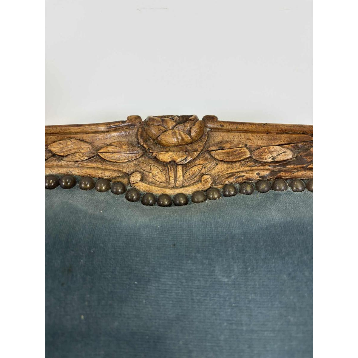 Seat and back upholstered in blue velvet. Slight wear visible on one seat (see photo).