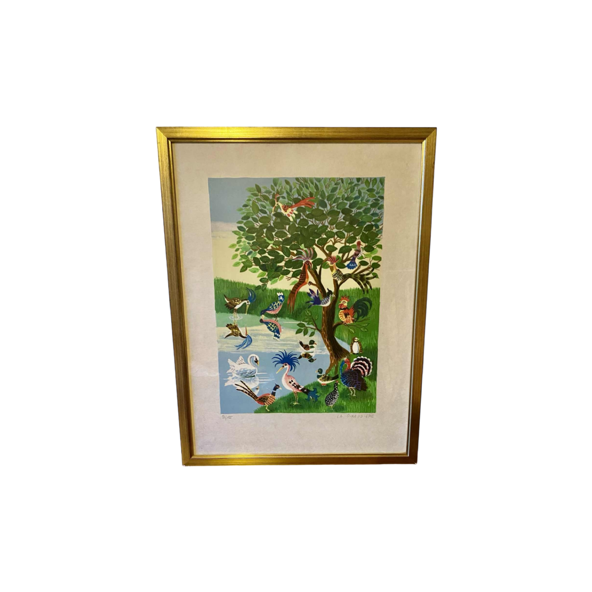 Colored lithograph depicting imaginary birds. The painter, Mady de la Giraudière (1922 - 2018) is known as a "naive" painter. This copy is numbered 74/195 and signed in pencil under the print. It is framed under glass. Dimensions: 70 x 52 cm.