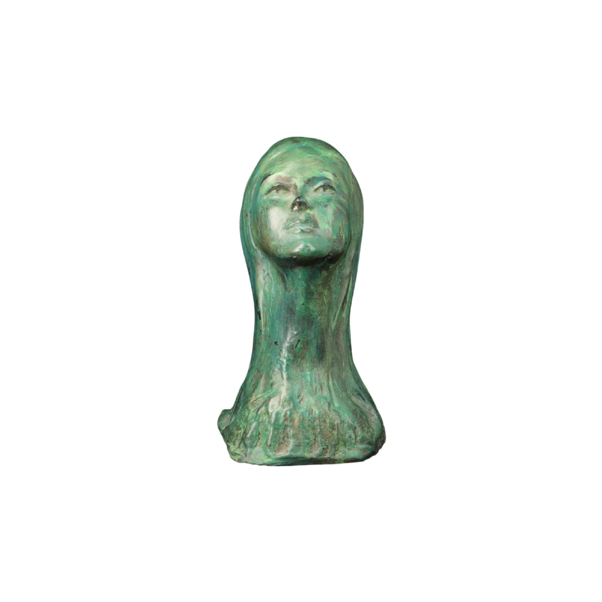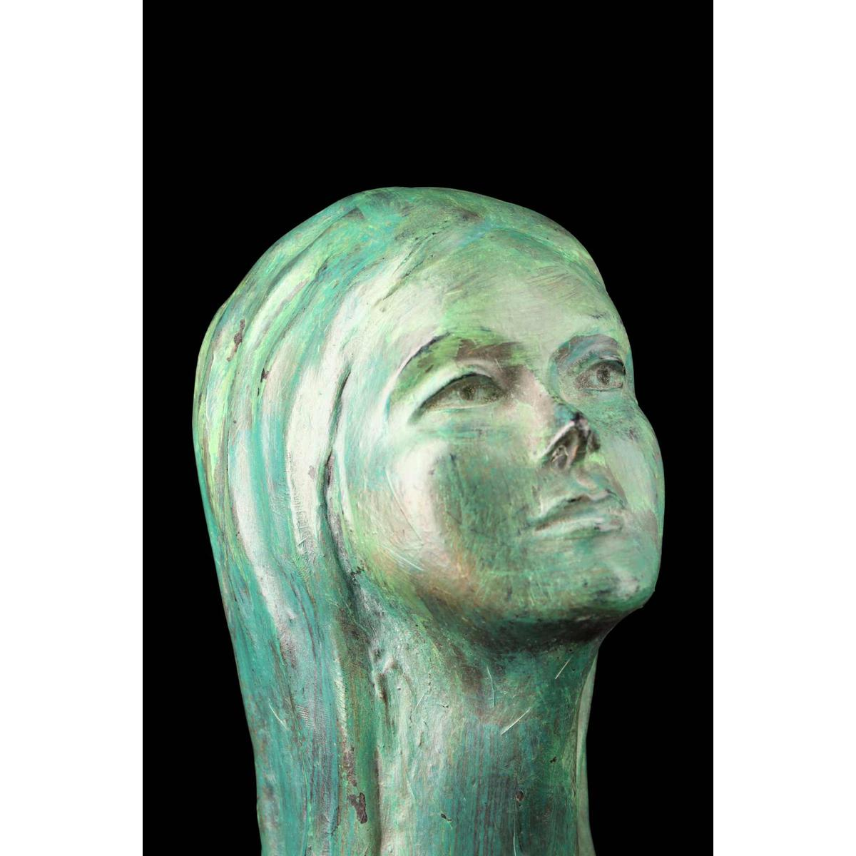 This composite-material bust depicts a young woman with her face turned skyward, expressing a dreamy or contemplative posture. The soft lines of the sculpture, and the flowing hair blending into the base, evoke a harmony between the human and the natural. The green patina reinforces the dreamlike, timeless aspect of the work.