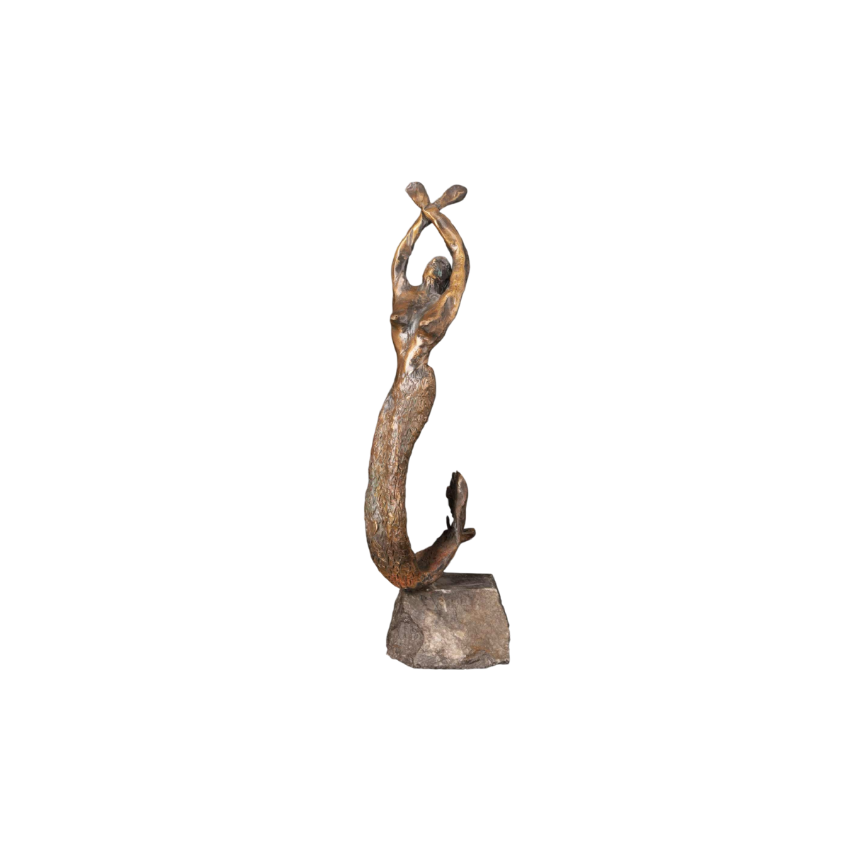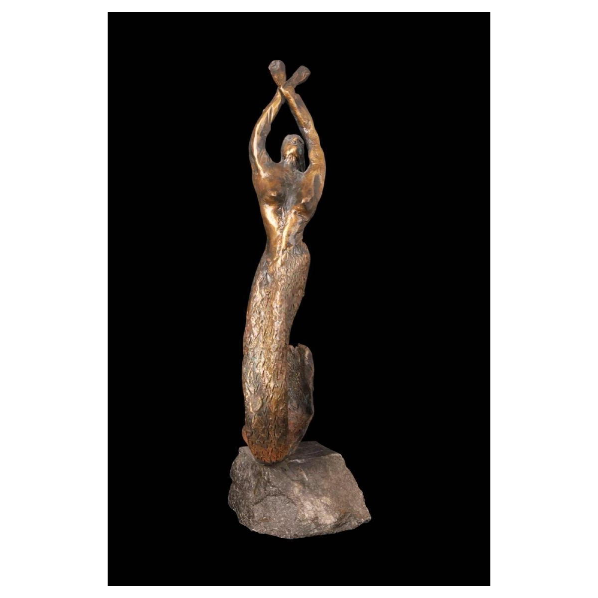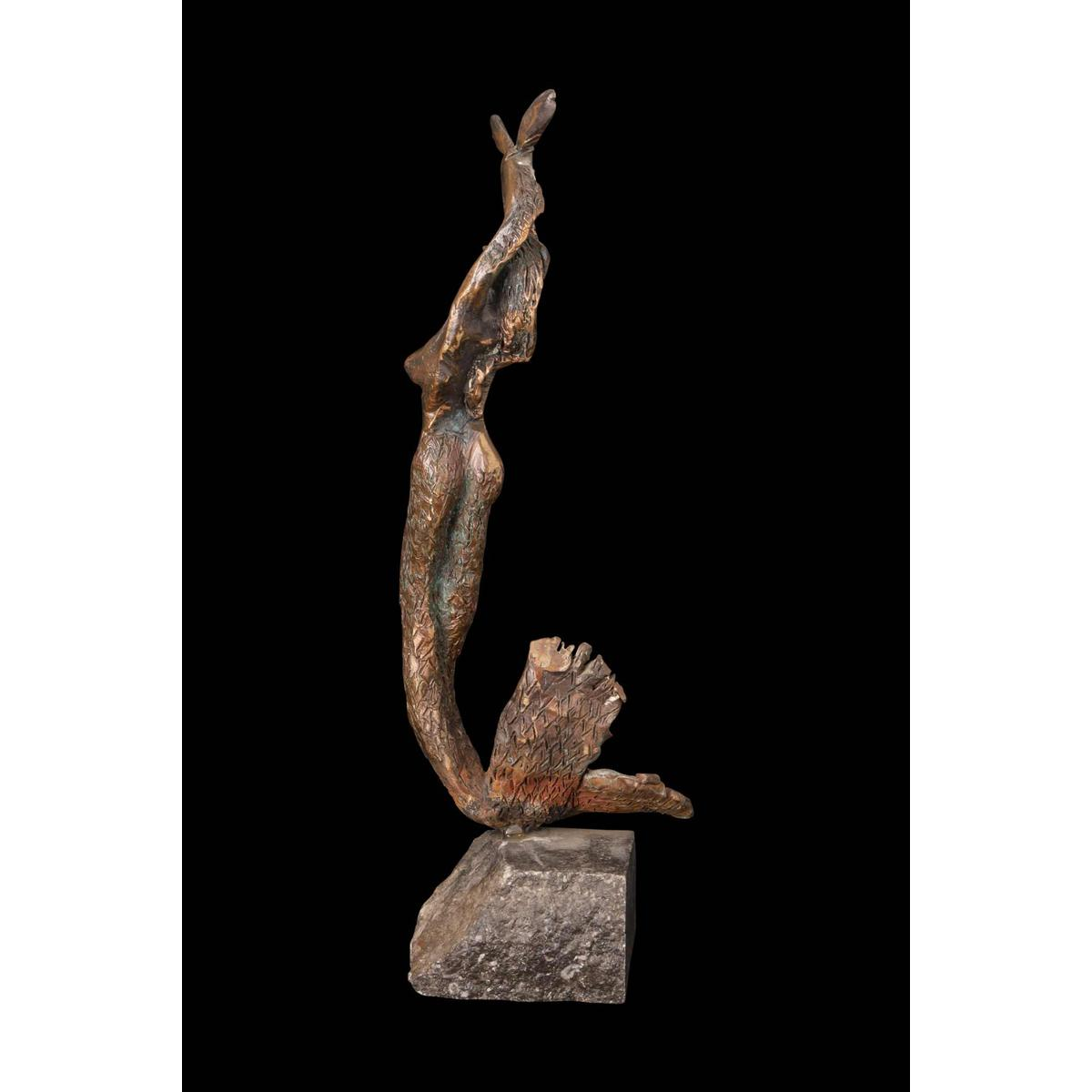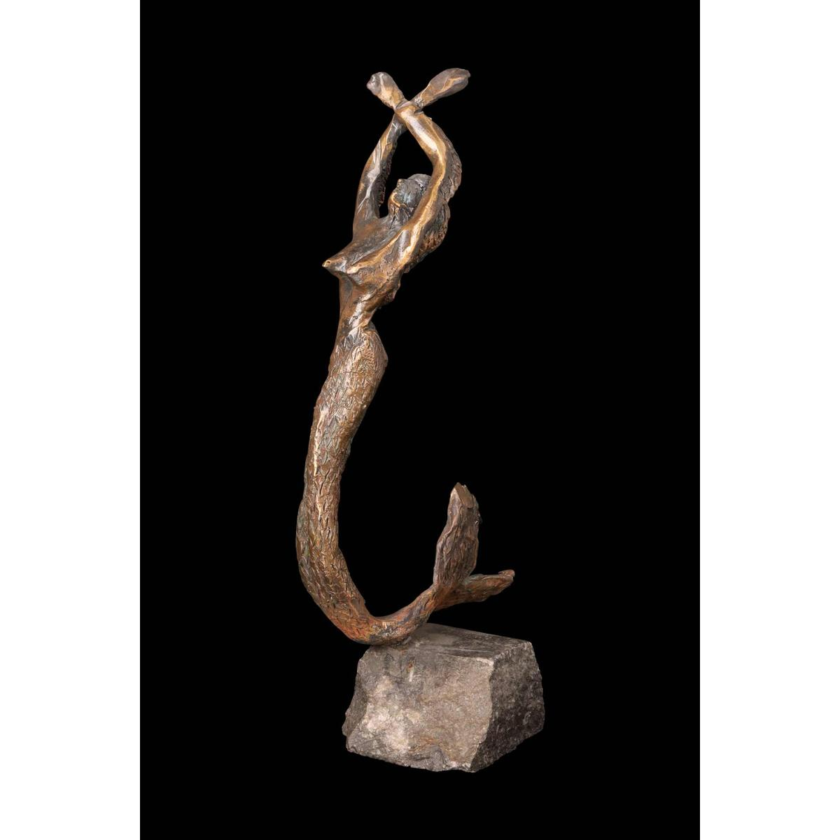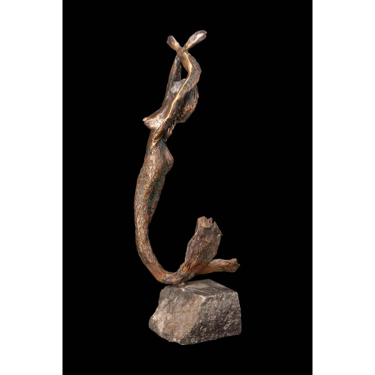This captivating sculpture depicts a slender mermaid, rising vertically from her rough stone base, arms raised and crossed above her head.