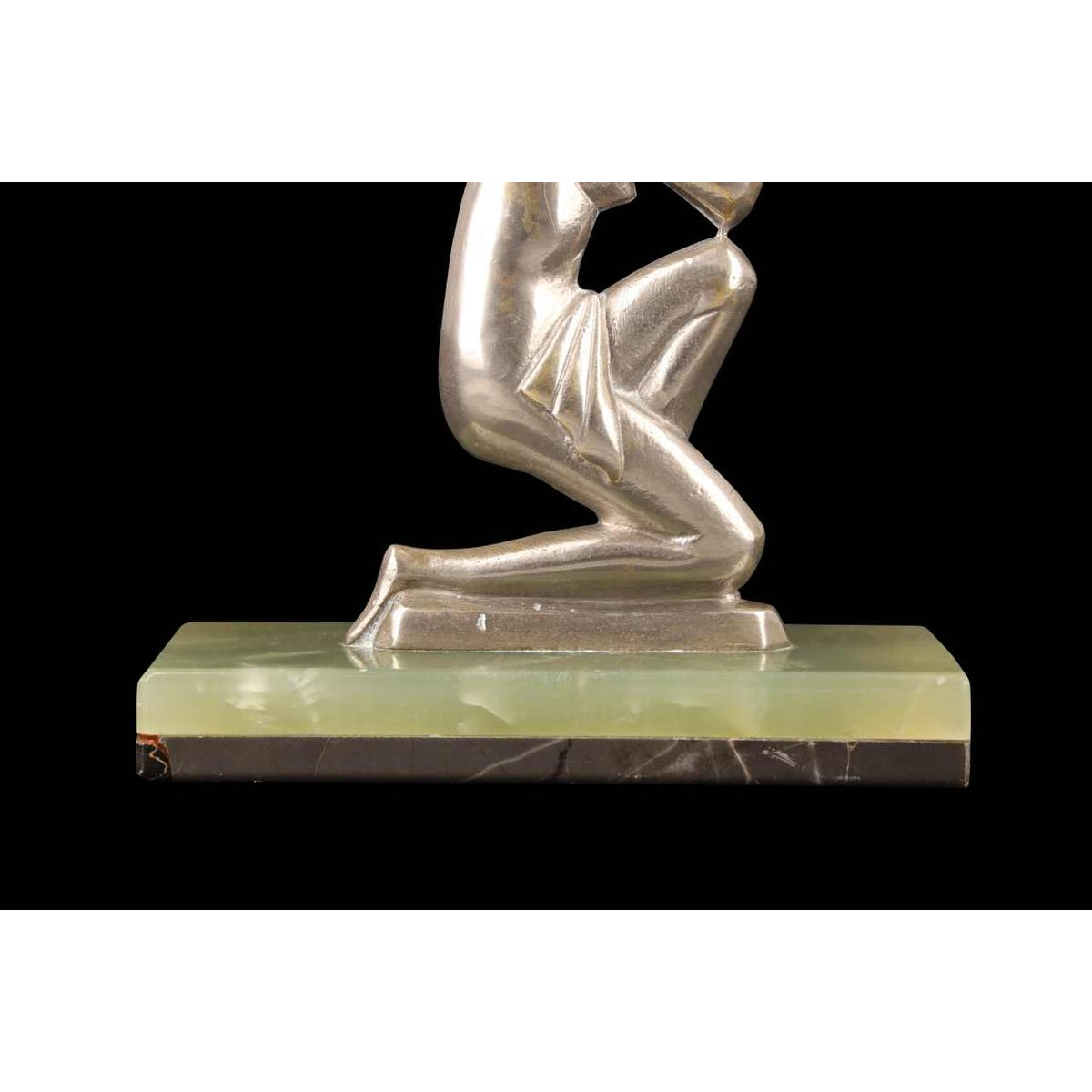 It features the movement's typical canons: geometric shapes, stylized human figures, noble materials and refined contrasts (here between the shiny metal and the stone base).