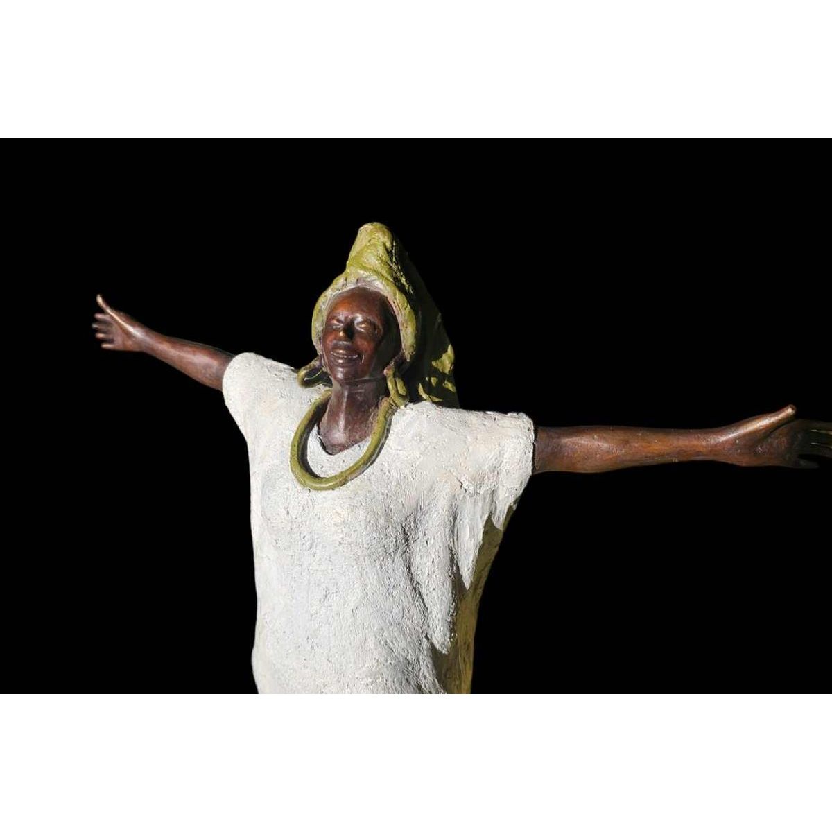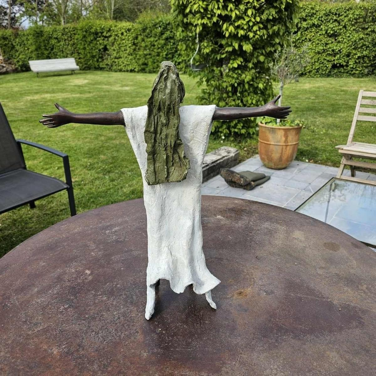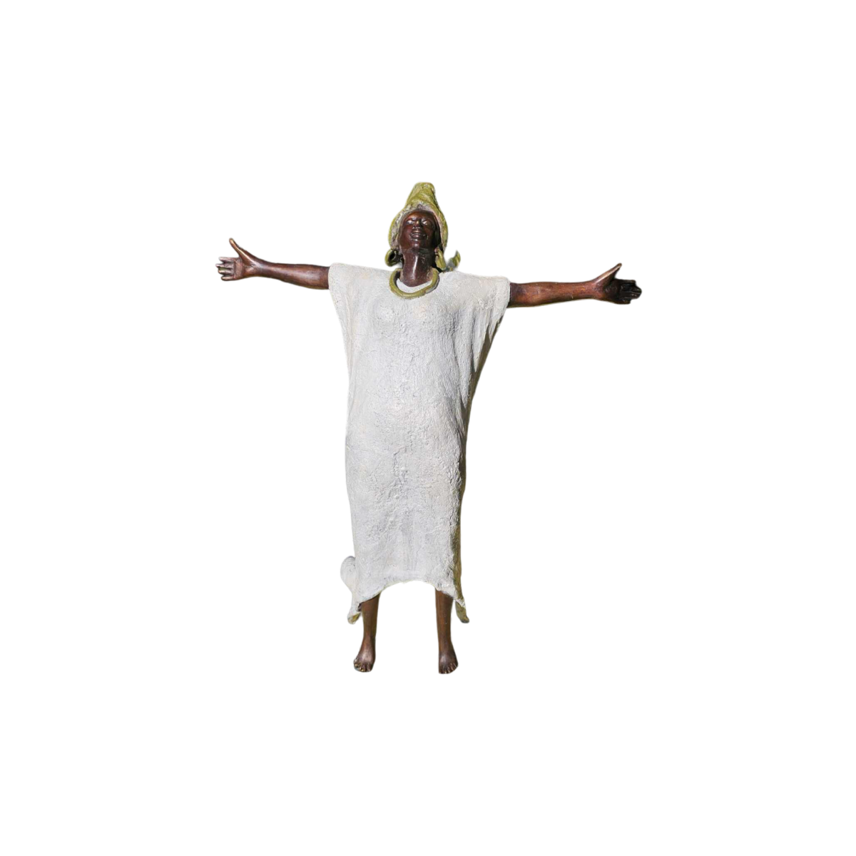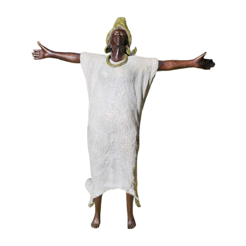 ELEGANT WOMAN WEARING A SCARF FALLING BACKWARDS, STANDING ON TIPTOE WITH HER ARMS OUTSTRETCHED TO BREATHE DEEPLY. MUCH REFINEMENT AND SENSITIVITY FROM THE ARTIST. Bronze artist Adama GANDEMA has been exhibiting his work in Belgium and abroad for over 25 years. In a hard, rigid metal, he succeeds in expressing all his sensitivity and creativity. Attentive to the world around him, he reproduces in each of his sculptures the emotions he perceives in others, with dignity, finesse and respect. Since the age of 6, he has been 'manipulating' the material to give it all these qualities, so that it becomes an image of his personality.