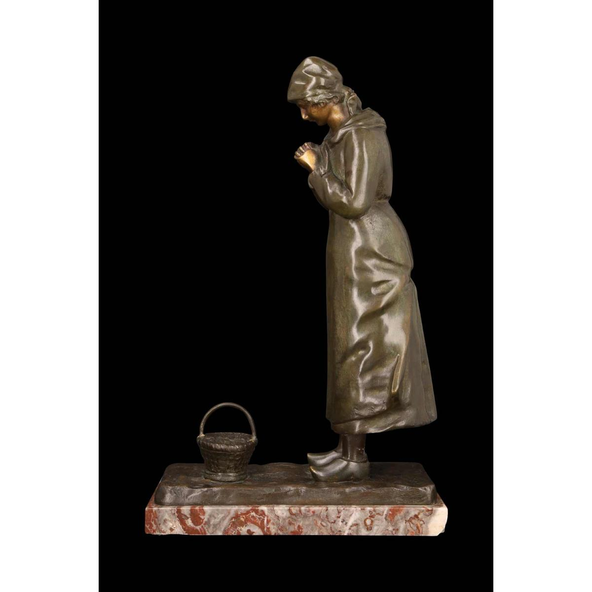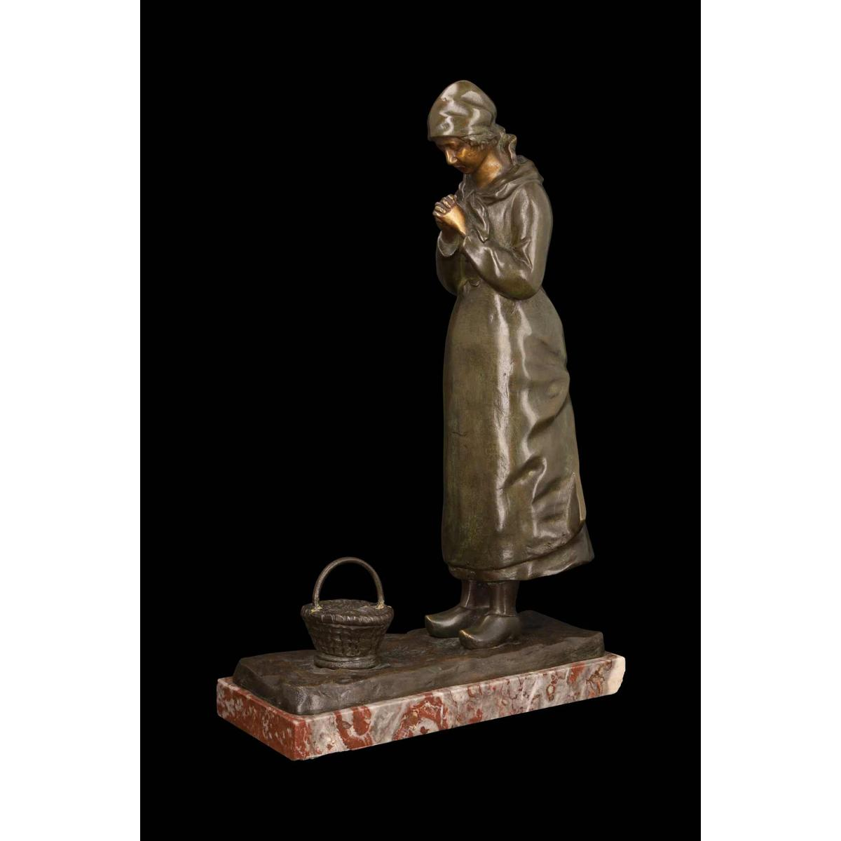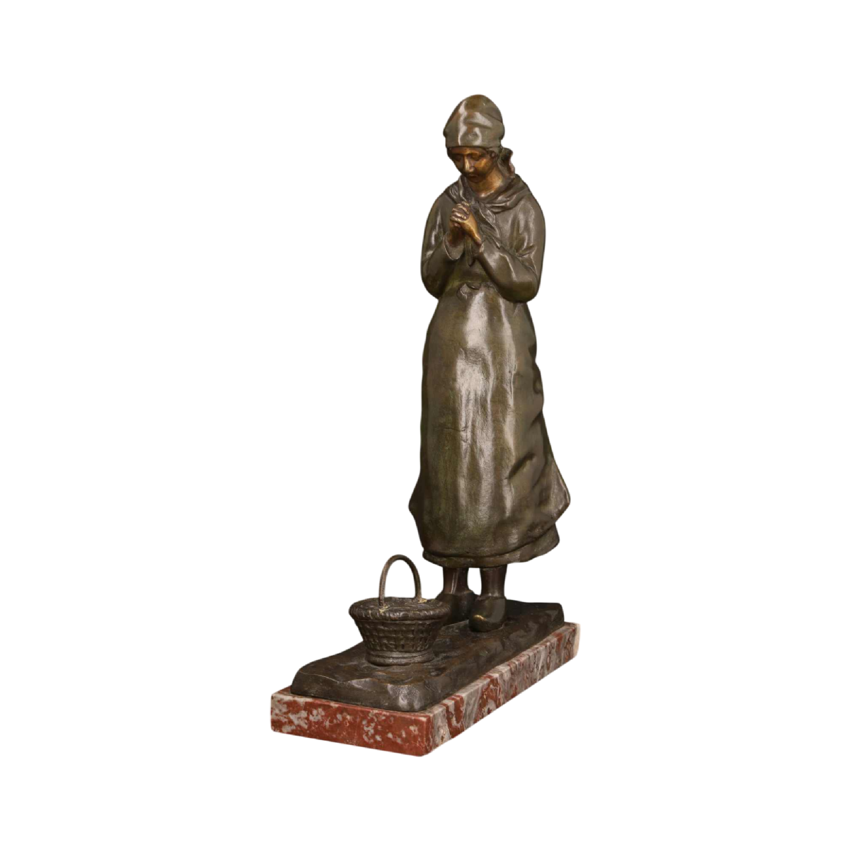 This bronze sculpture, entitled La Prieuse, depicts a young woman at prayer, her hands clasped and her head slightly bowed, in a posture of contemplation. Wearing a simple dress and a kerchief on her head, she embodies modesty and popular piety. At her feet, an empty basket rests on a textured floor. The work rests on a white-veined red marble base, reinforcing the scene's understated elegance. The figure's contemplative attitude, the precision of the drapery and the delicacy of the expression convey great sensitivity.