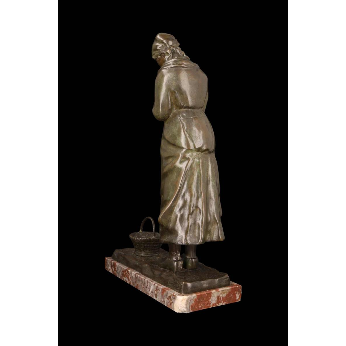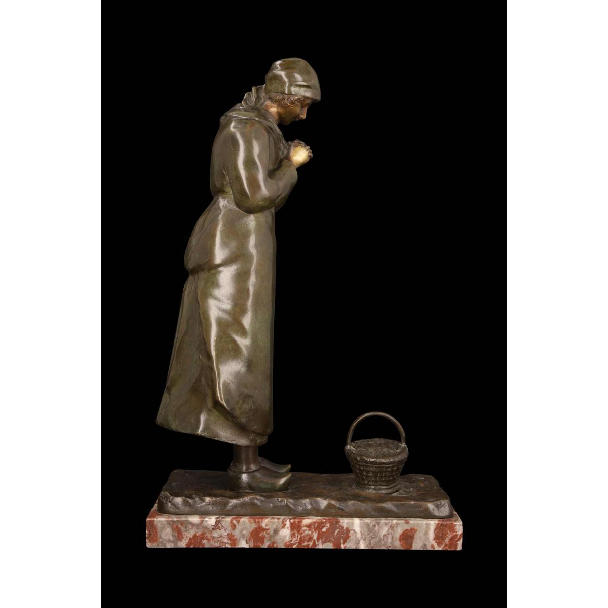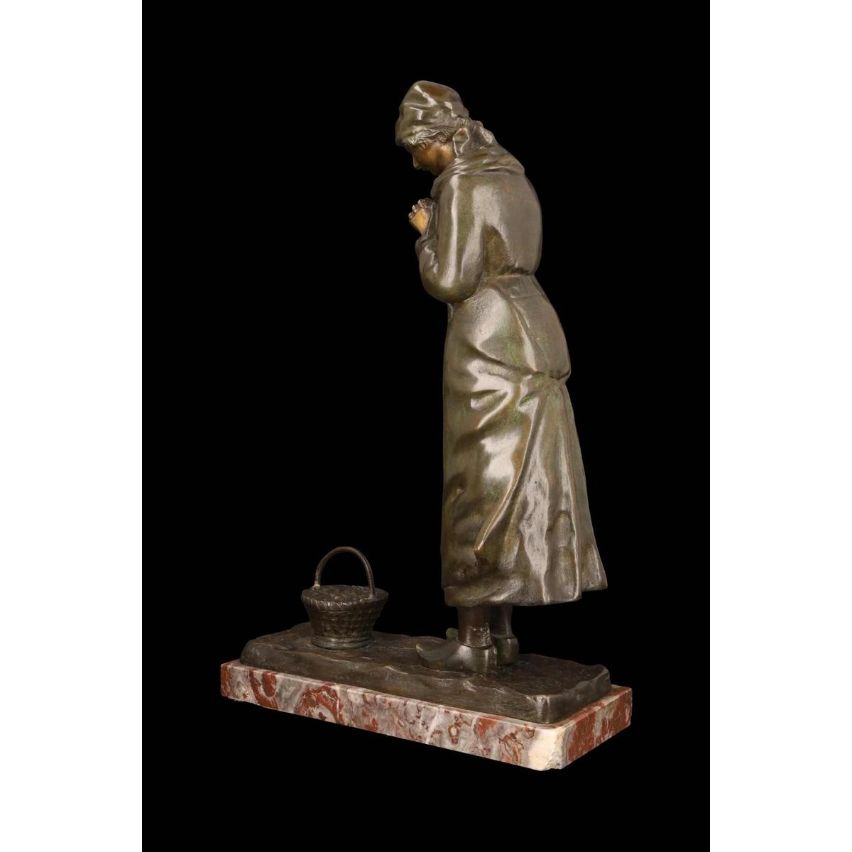 This bronze sculpture, entitled La Prieuse, depicts a young woman at prayer, her hands clasped and her head slightly bowed, in a posture of contemplation. Wearing a simple dress and a kerchief on her head, she embodies modesty and popular piety. At her feet, an empty basket rests on a textured floor. The work rests on a white-veined red marble base, reinforcing the scene's understated elegance. The figure's contemplative attitude, the precision of the drapery and the delicacy of the expression convey great sensitivity.