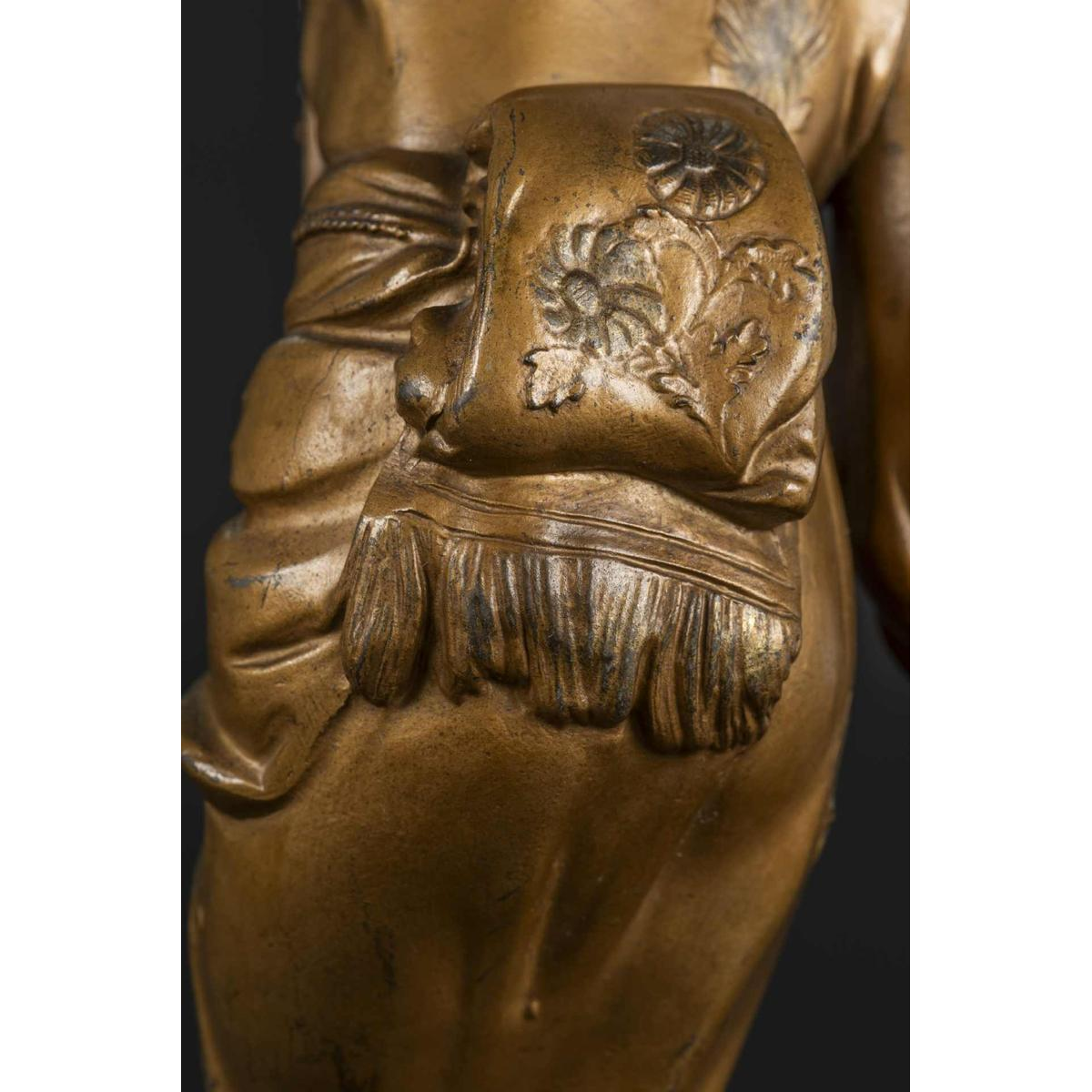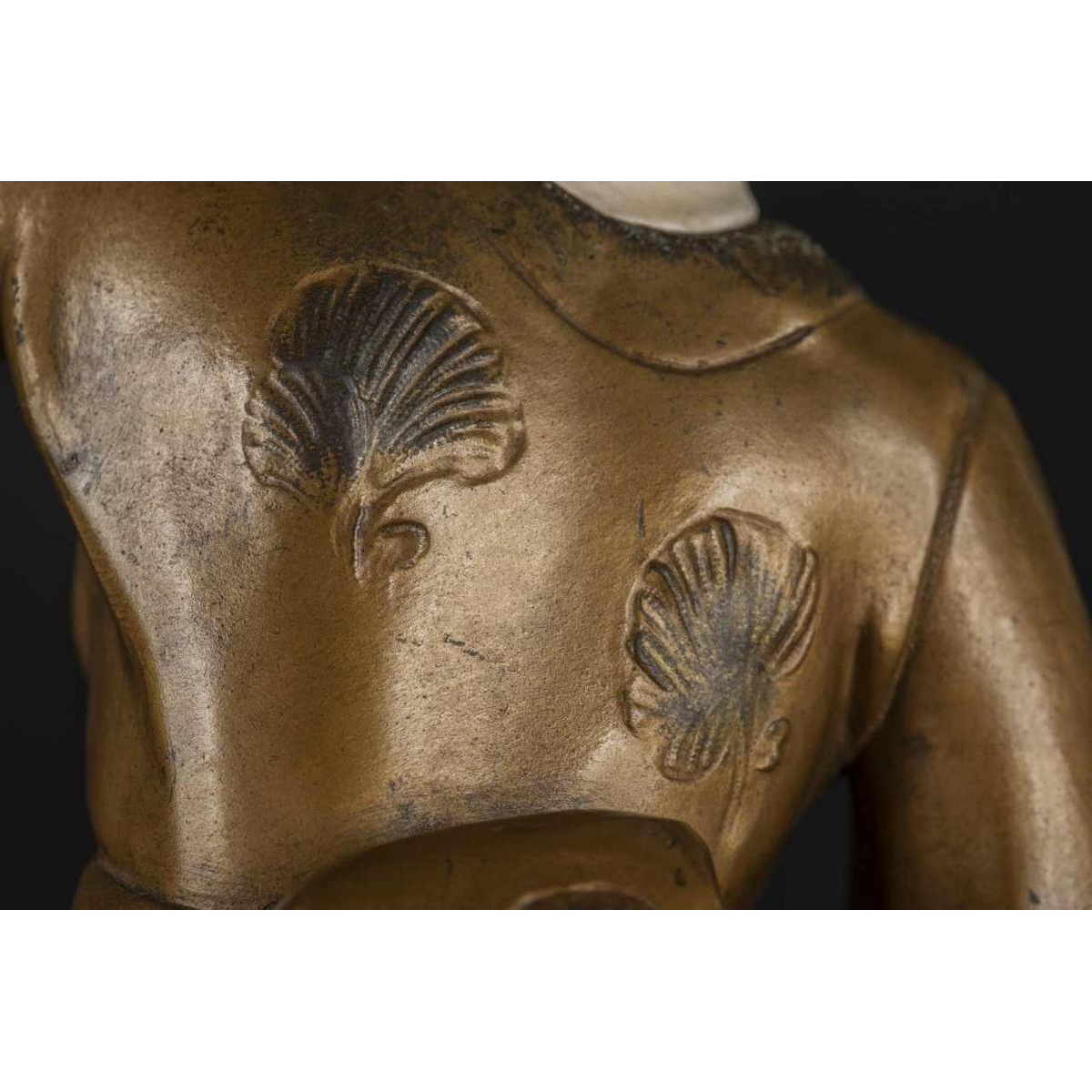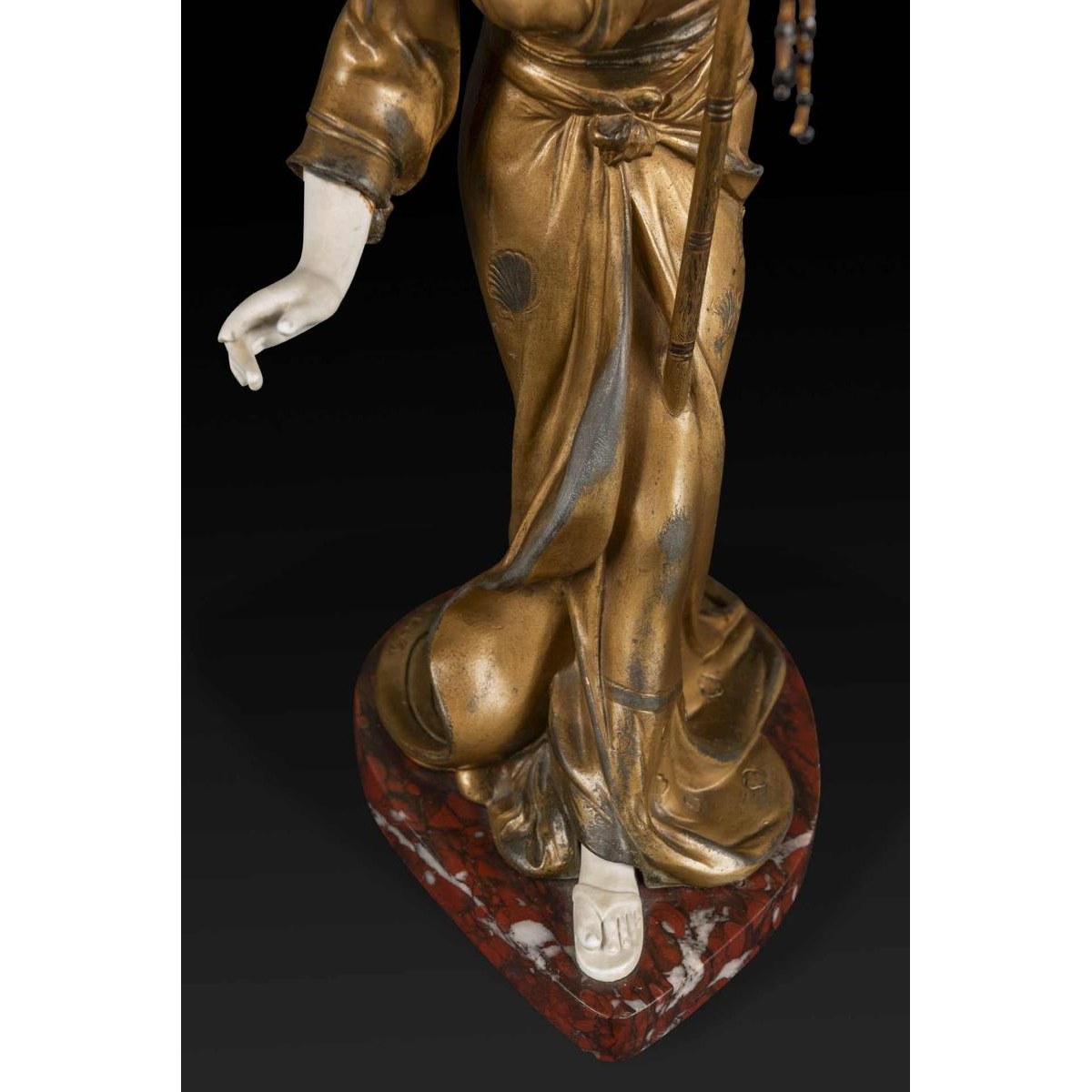 The sculpture is made from gilded regula and porcelain bisque. The feet, hands, arms, head and theatrical masks are meticulously crafted in biscuit porcelain, evoking the delicate style of chryselephantine works. The kimono, draped with remarkable finesse, is adorned with elaborate engravings that testify to the excellence of the craftsmanship.