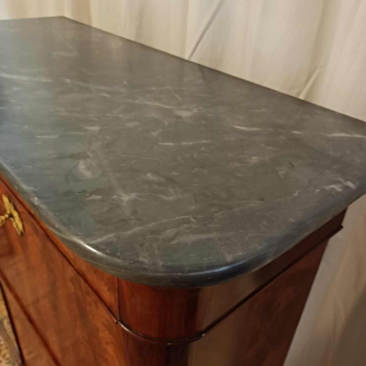 Restoration period secretary in mahogany veneer, opening by a drawer with doucine, a flap discovering a theater with niche darkened by a mirror and drawers (2 secret drawers and a cache), rounded uprights, ormolu keyholes with cornucopia, gray marble top....