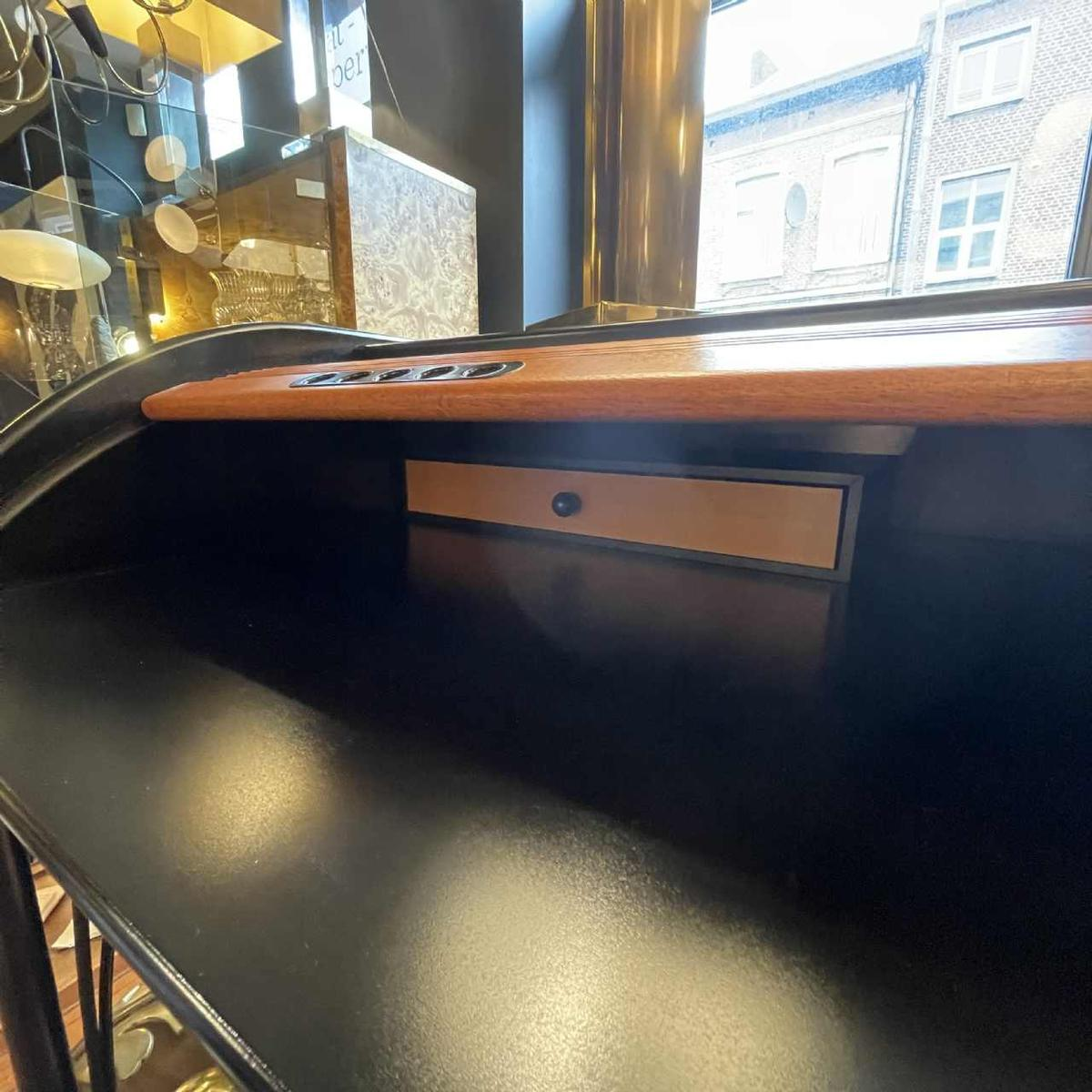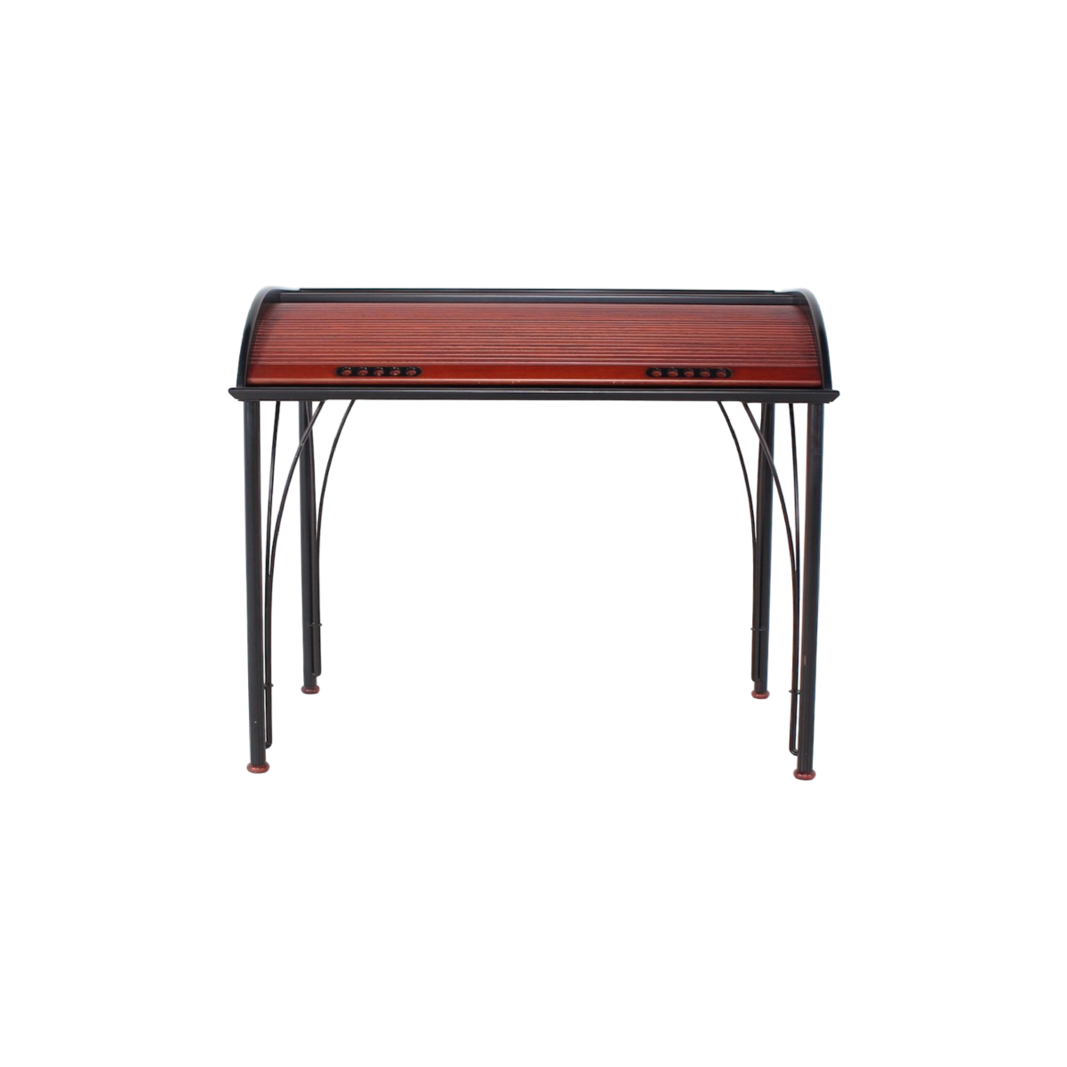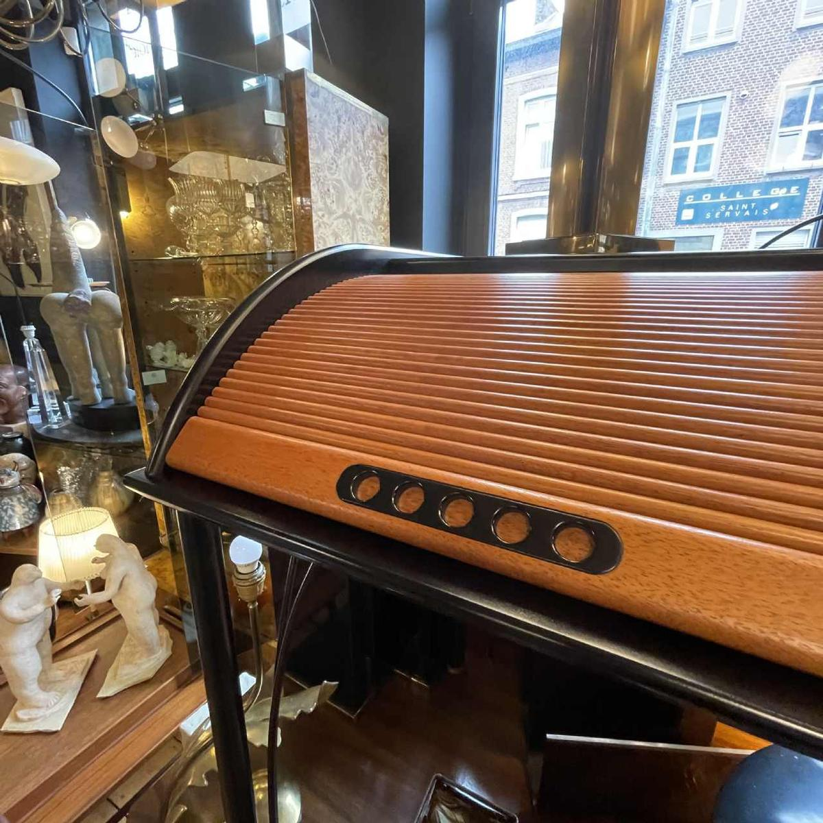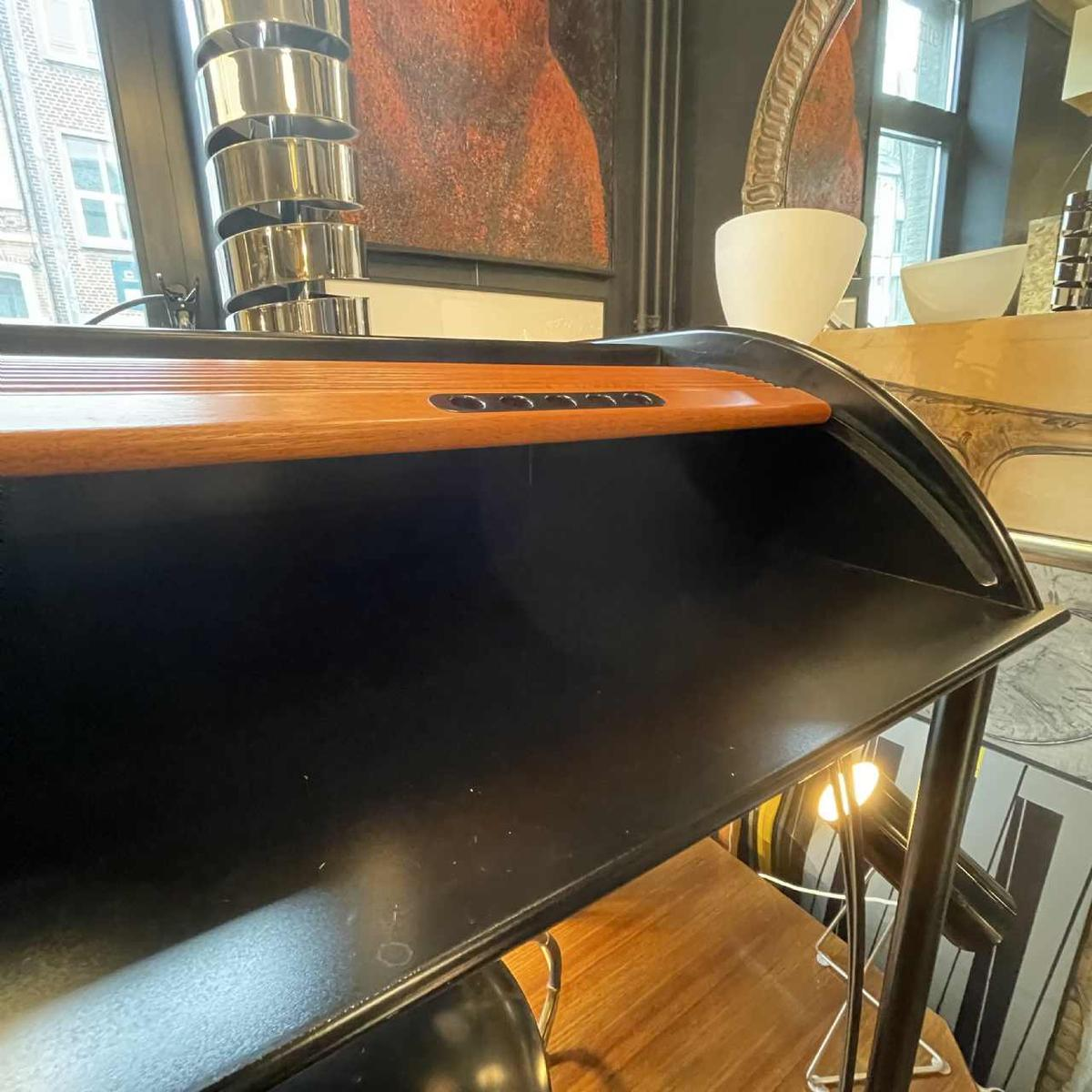 Lacquered steel structure with black lacquered wooden sides, scrolling shutter and claw feet in blond oak, removable drawer unit, model created in 1988.