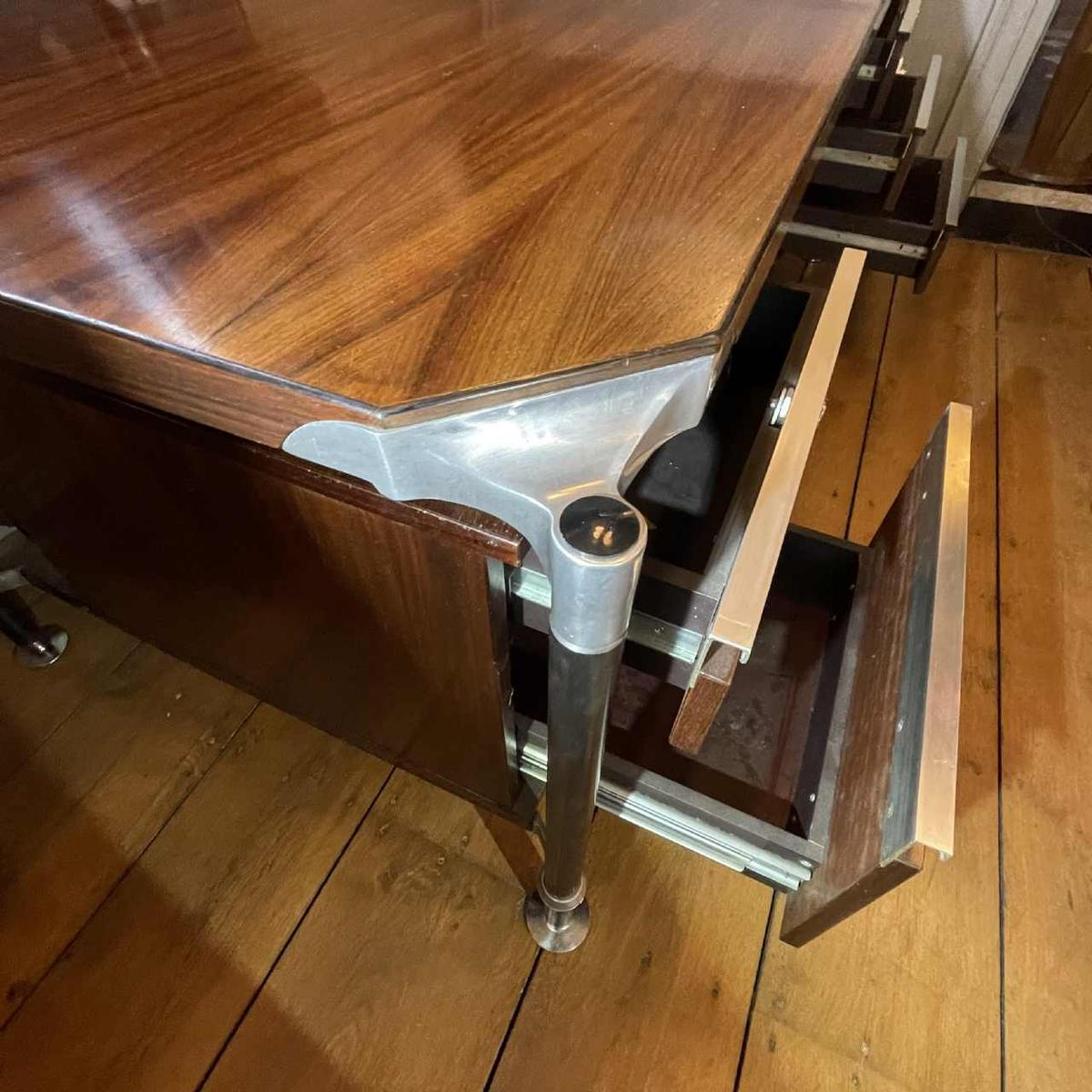 Table top, panels and drawers made of rosewood veneer, detached cast aluminium and anodised aluminium base spacer and legs.