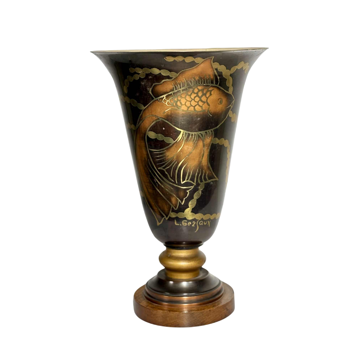 The piece is signed in the decoration by Lucien Gerfaux, a French artist active during the 20th century who produced decorative objects, notably vases and lamps in dinanderie (embossed or inlaid metal, often copper or brass), often with animal or naturalistic motifs.