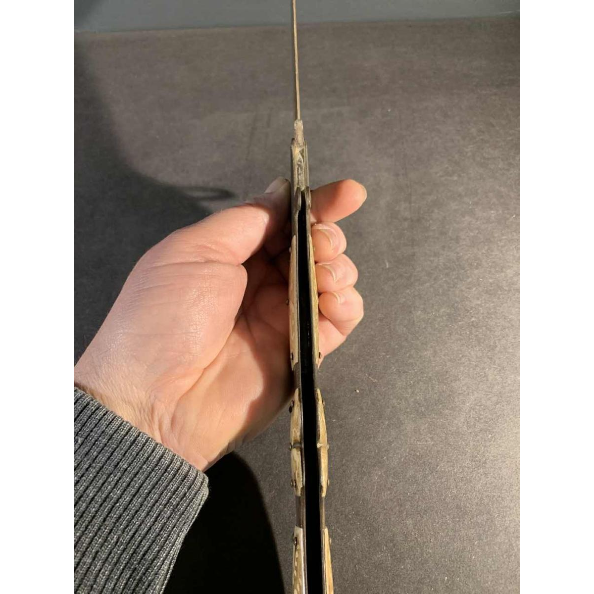 Exceptional antique NAVAJA or NAVALLA (in Catalan) folding knife, curved brass frame with bone plates decorated with hot-engraved foliage patterns. Heel called ' rattlesnake tail ', trigger ring bell, strong counter-edged blade marked with. the ' Valero Jun Zaragoza ' stamp (see photo). Spain, 19th century. Open length: 59cm Closed length: 32cm Very good condition, works perfectly, a small lack of bone to report (see last photo detail). Models similar to ' Navajas de Toledo '.