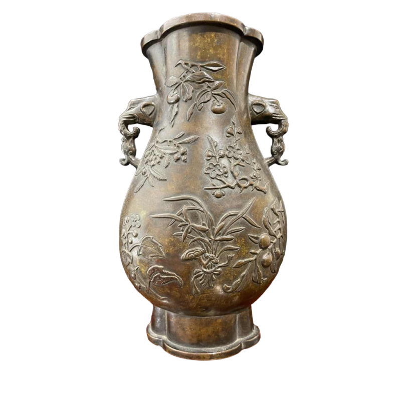 A bronze baluster vase decorated in relief with lotus flowers, peaches, lemons, vines, pine cones and pomegranates on one side. On the other: ruyis, apples and cherry blossom. The handles show the heads of elephants and dragons facing each other. Provenance: Baron Eugène Beyens (1816-1894) Minister of State and Ambassador to H.M. the King of the Belgians, and later his descendants.