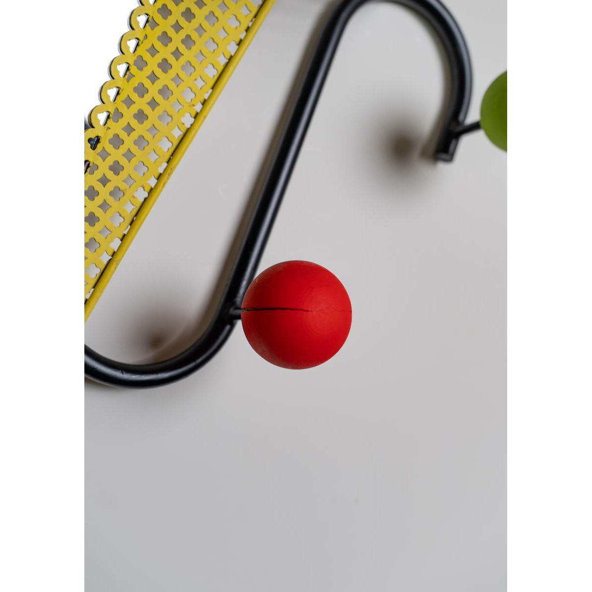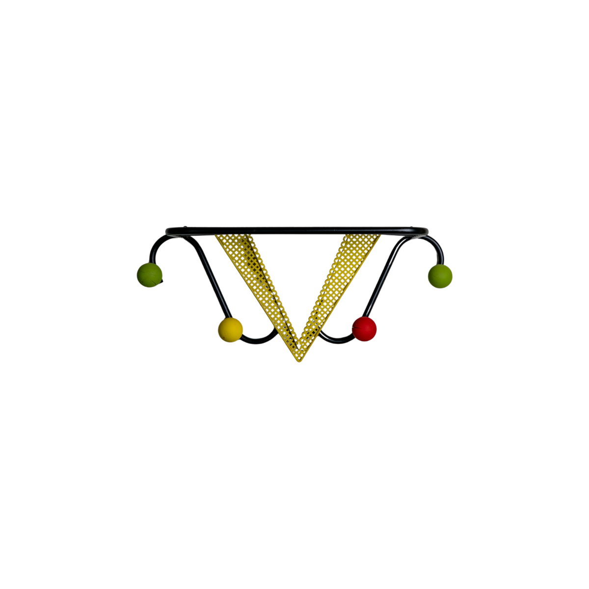 Joli portemanteau mural Mathieu Matégot des années 1950 / 1960. Structure en métal tubulaire noir avec empiècement triangulaire en tôle perforée au trèfle, dit « rigitulle », de couleur jaune, recevant un miroir triangulaire. Il est également composé d’une étagère / porte-chapeau et de 4 patères boules de couleurs rouge, vert et jaune.