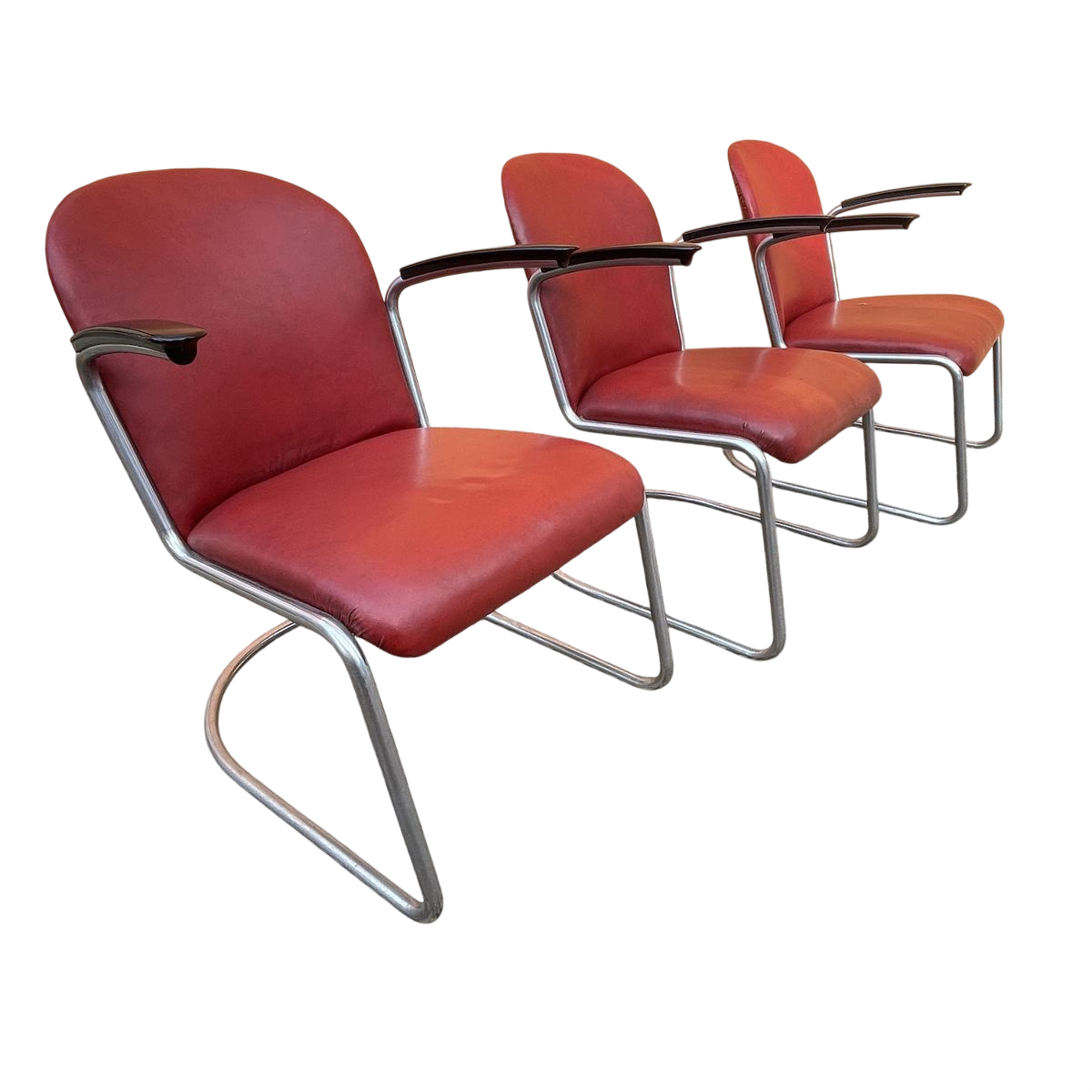 WILLEM HENDRIK GISPEN, set de 3 fauteuils 413 Art Déco moderniste, structure cantilever tube d'acier, design Bauhaus 1930s