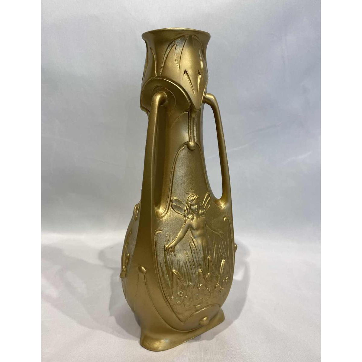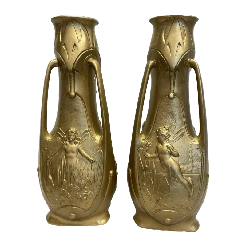 Vases en régule doré, signés Jean Garnier. Paire de vases art nouveau en étain patine bronze doré à motifs de nymphes en bas relief sur décor bucolique, avec 3 anses latérales détachées. Signés Jean Garnier, vers 1900. En très bon état. Hauteur : 31cm Jean Garnier est un artiste né en France en 1853 et décédé vers 1910. Les œuvres de l'artiste ont été mises en vente aux enchères publiques 291 fois, principalement dans la catégorie Sculpture-Volume. La plus ancienne vente enregistrée a eu lieu en 1991 chez Sotheby's