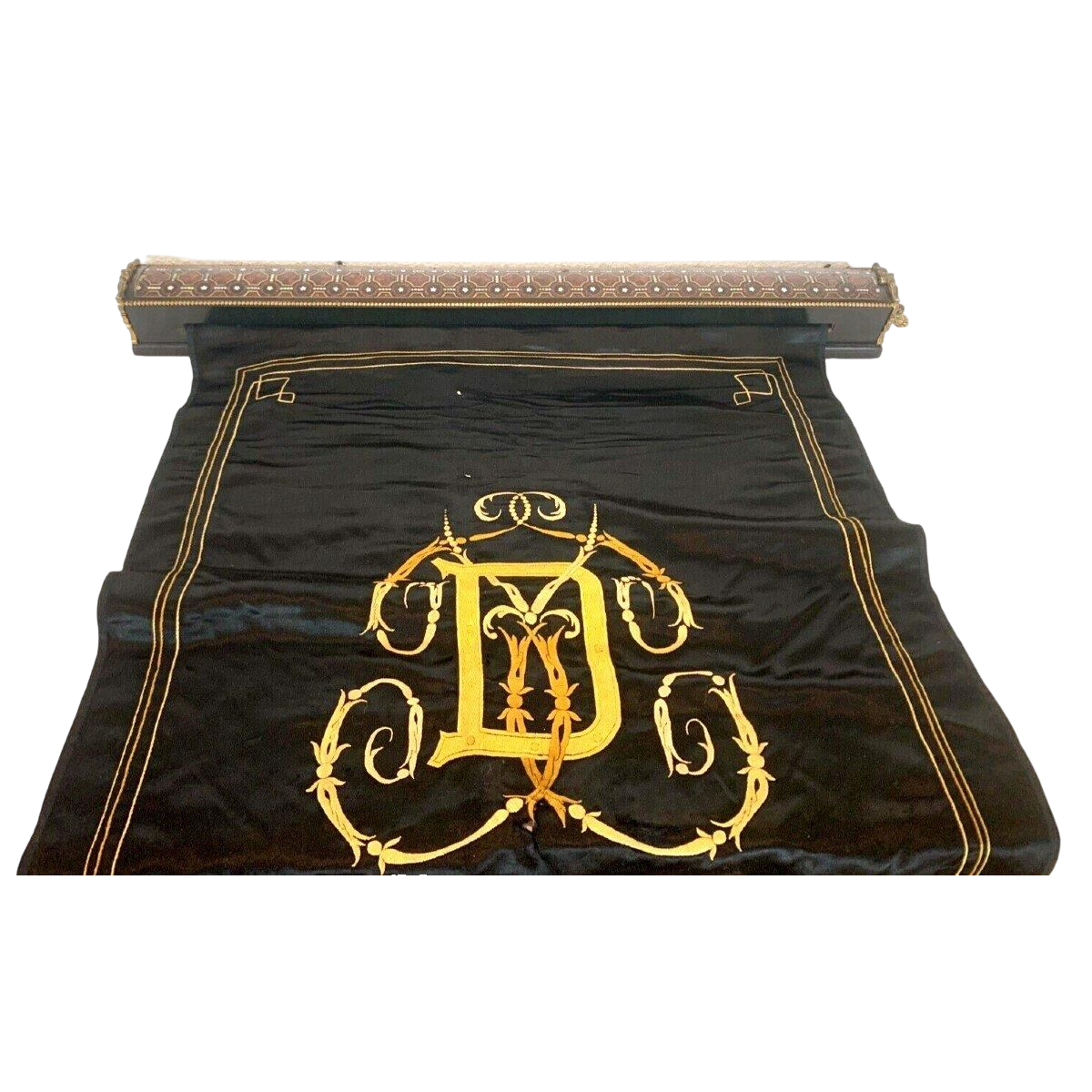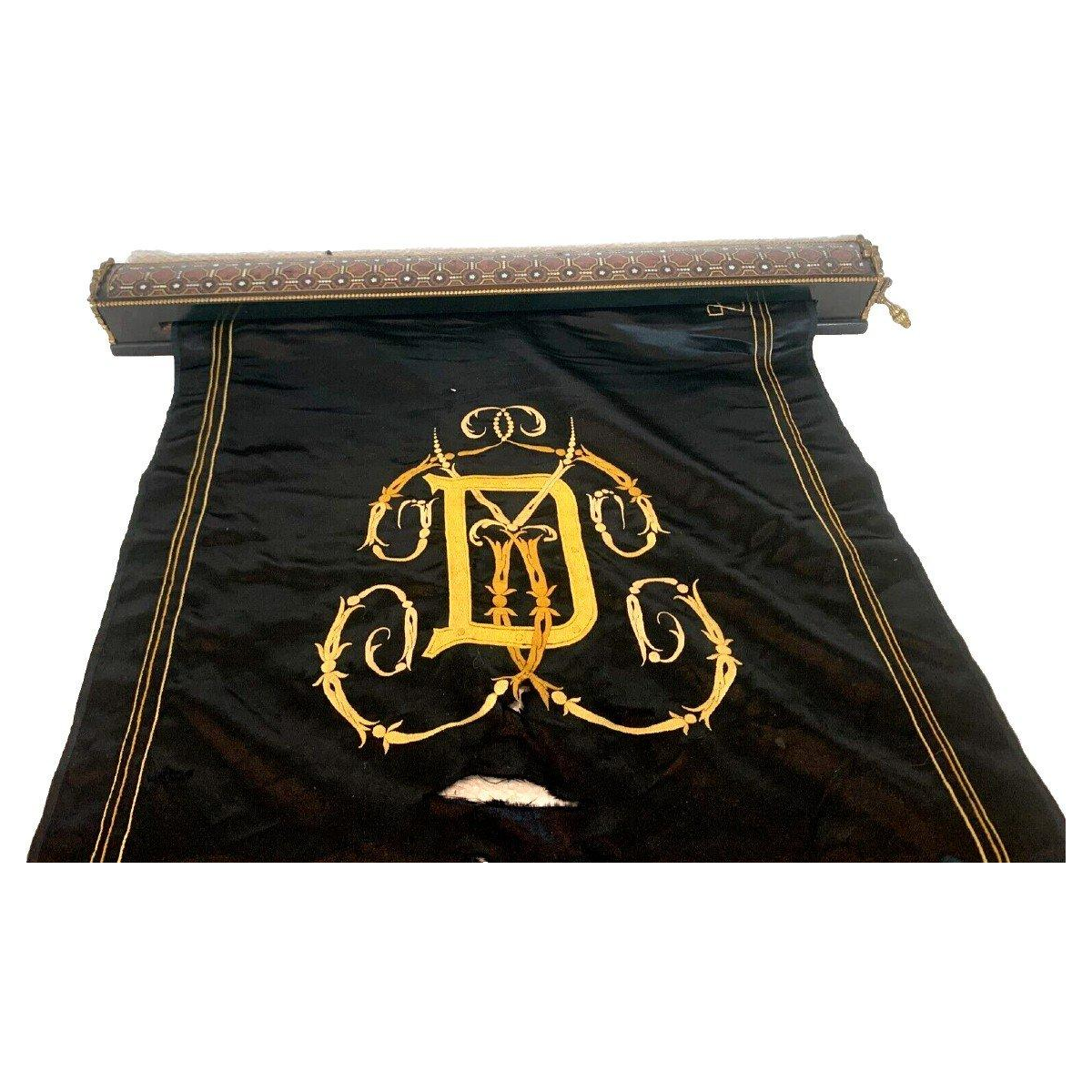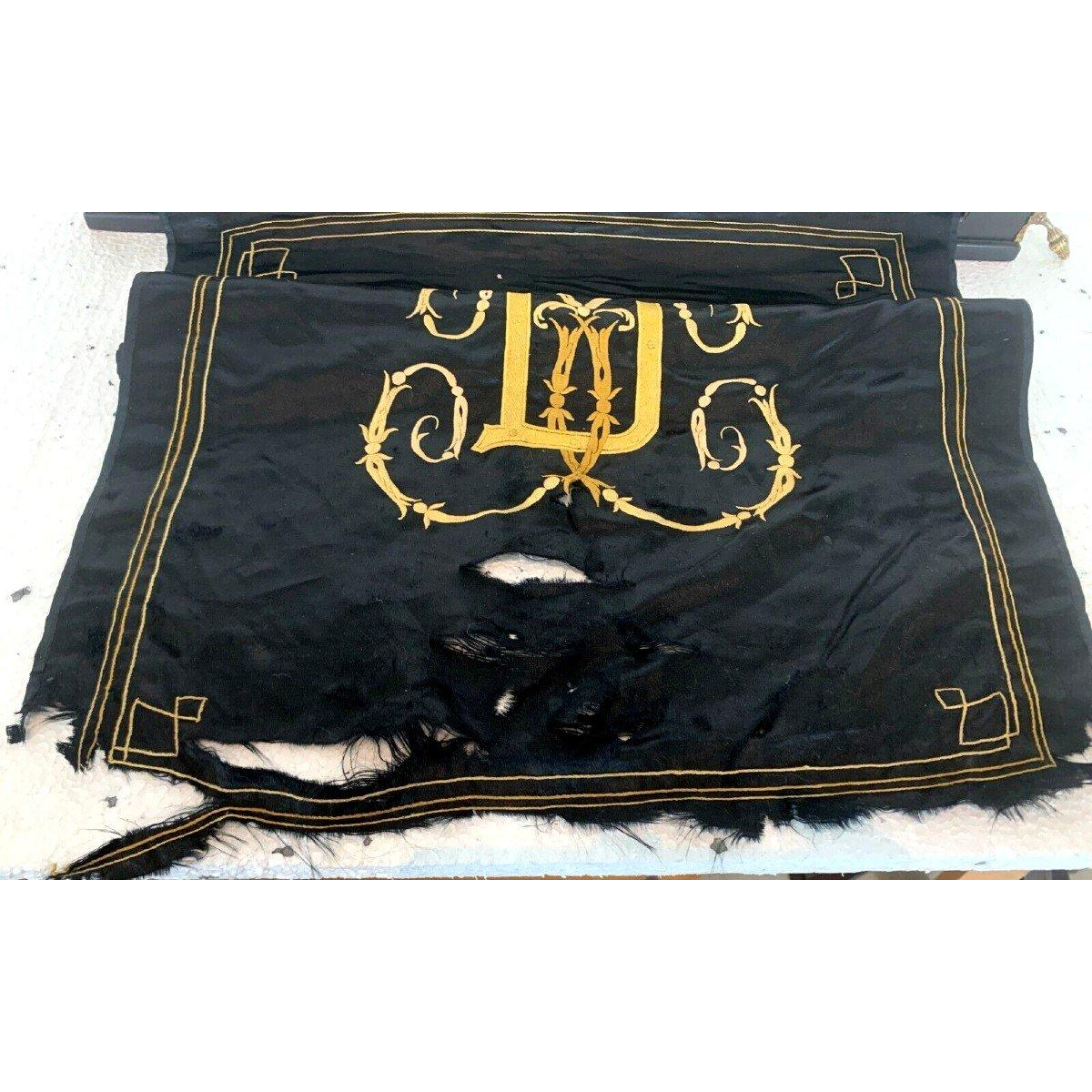 Soierie noire brodée au fil d’or.