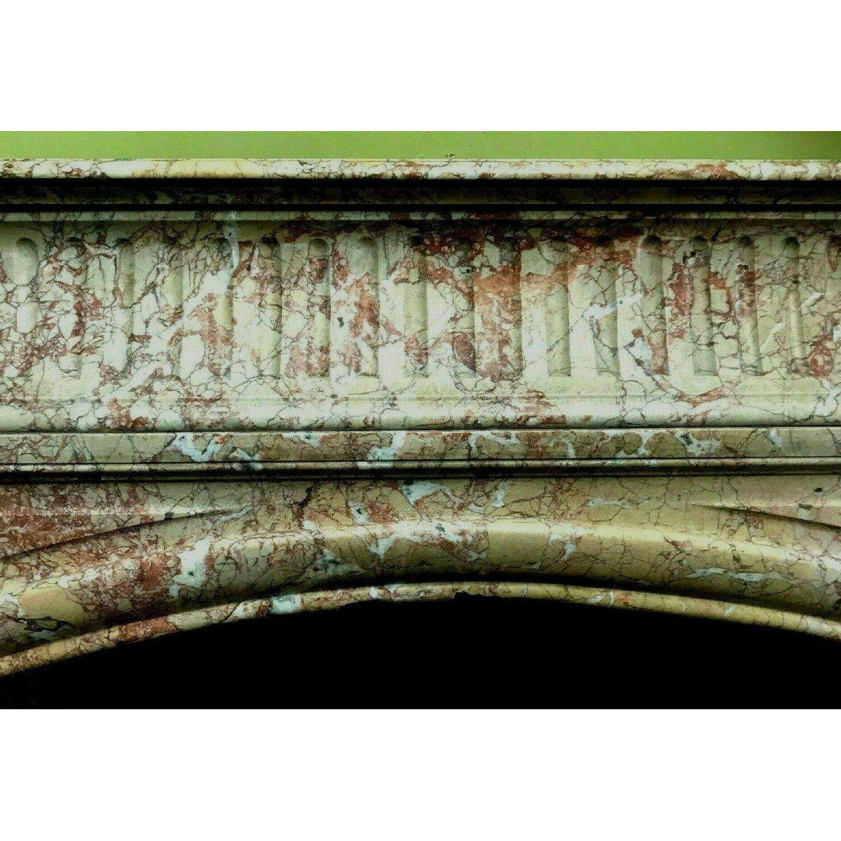 Marbre rose veiné moucheté, jambage et fronton à motif en relief, hotte à cannelures.
