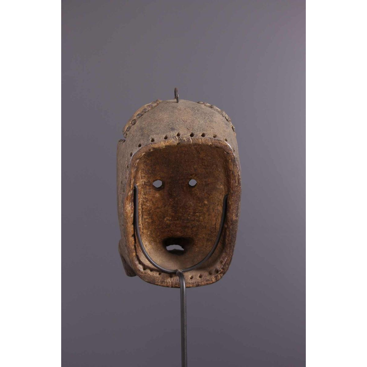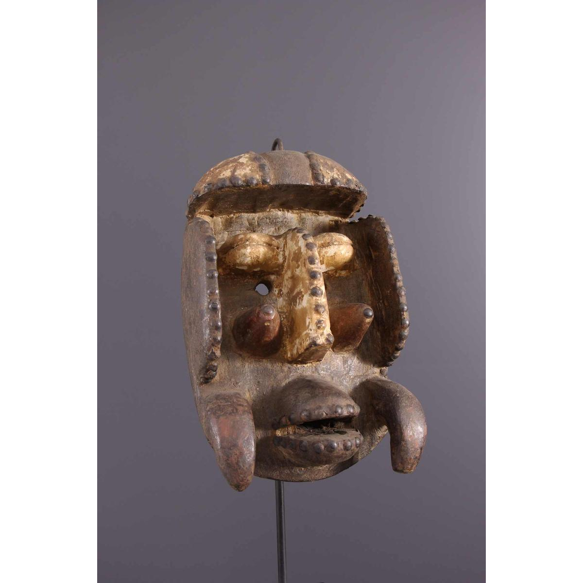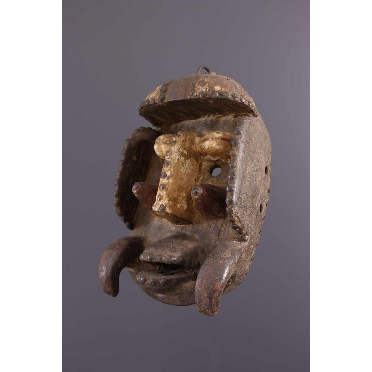 Ce masque présente diverses excroissances, parmi lesquelles des clous tapissiers rehaussent la patine sombre. Le front évoque un casque guerrier, une caractéristique distinctive de ces masques conçus pour inspirer la crainte. Principalement utilisés dans l'Ouest de la Côte-d'Ivoire par les Bété, ces masques ont été influencés par la société des masques Gla Glaé des populations Wobé et Guéré, formant un ensemble désigné sous le nom de Wé, signifiant "les hommes qui pardonnent facilement". Ce groupe culturel Krou a hérité de ces traditions transmises et enseignées par les Nyabwa.