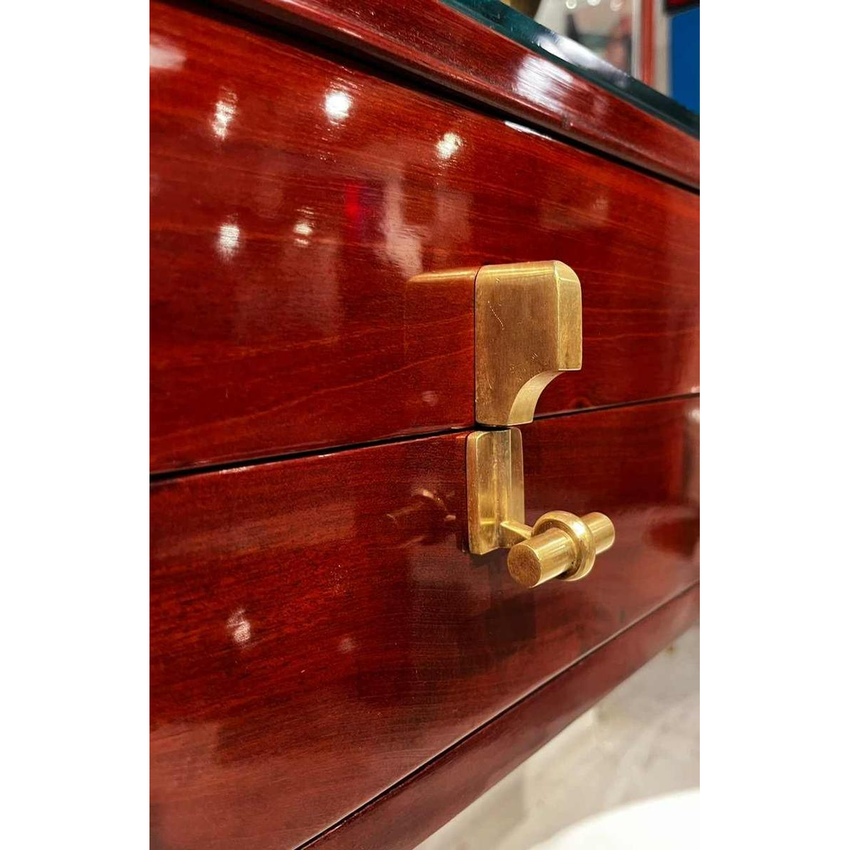 Ce meuble a été totalement restauré et repoli au tampon. Il est complété par une tablette de verre d'origine qui ne doit pas nécessairement être installée mais qui protège la tablette en bois poli et agrandit sa surface utile.