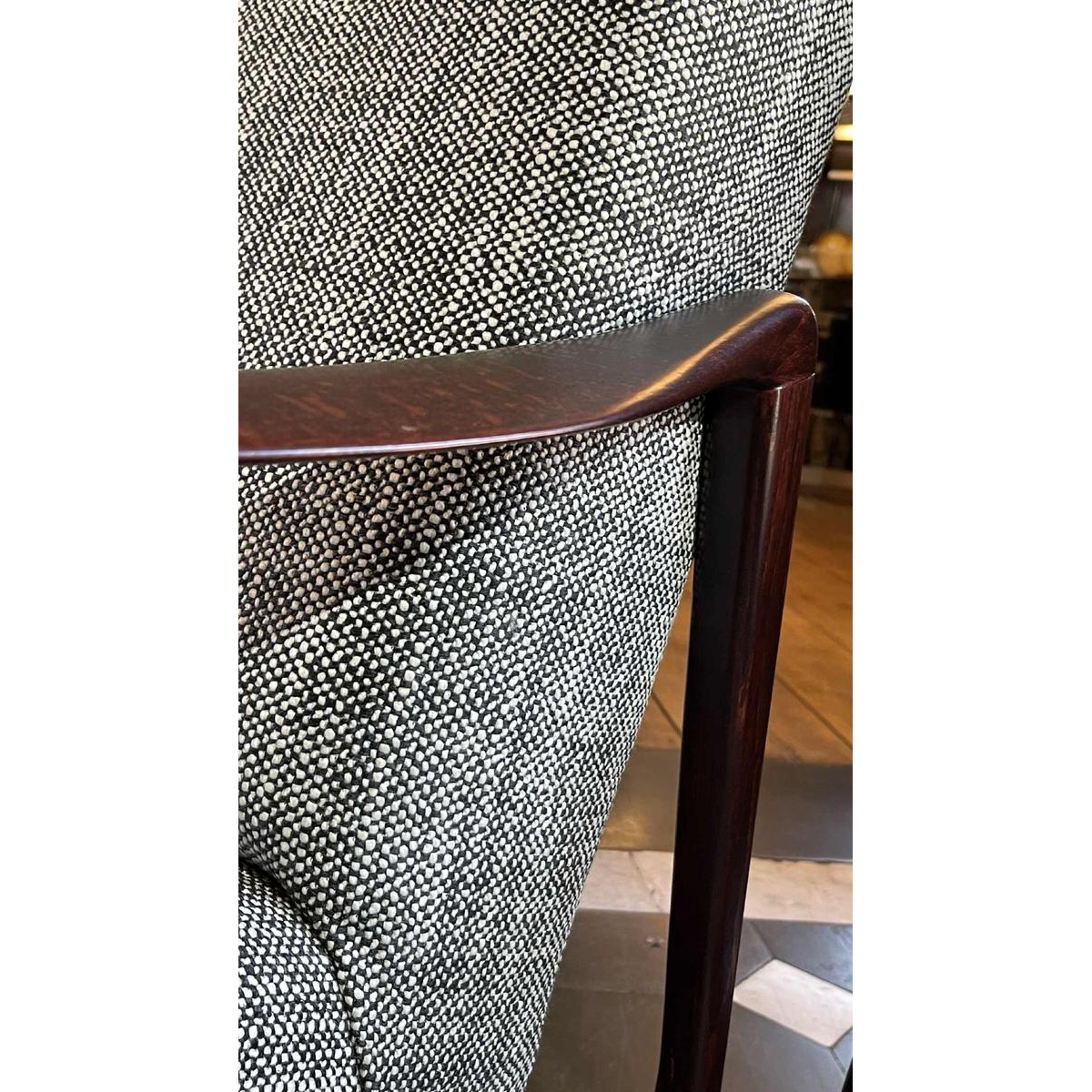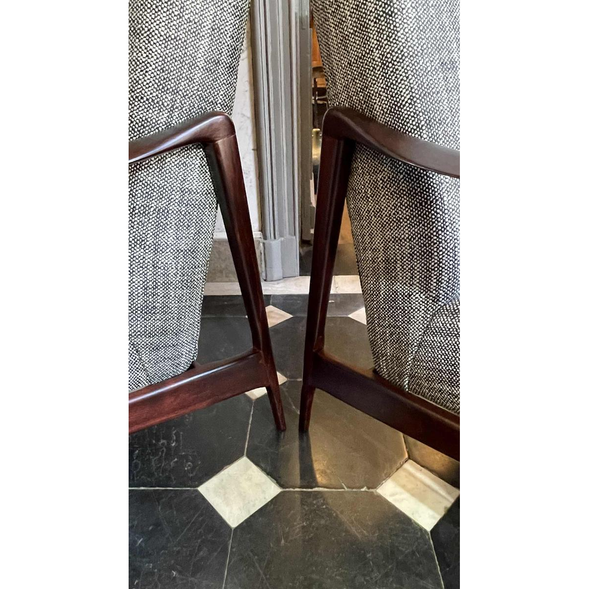 Paire de fauteuils vintage des années 1950s. Design sobre scandinave, dans le style ou de Arne Vodder, très confortable. Entièrement restaurés, structure d'assise démontée et rassemblée (vissée et collée), garnissage neuf, tissus qualitatif et boiserie de hêtre teinté acajou vernis. Hauteur d'assise: 42 cm. A emporter ou à livrer...