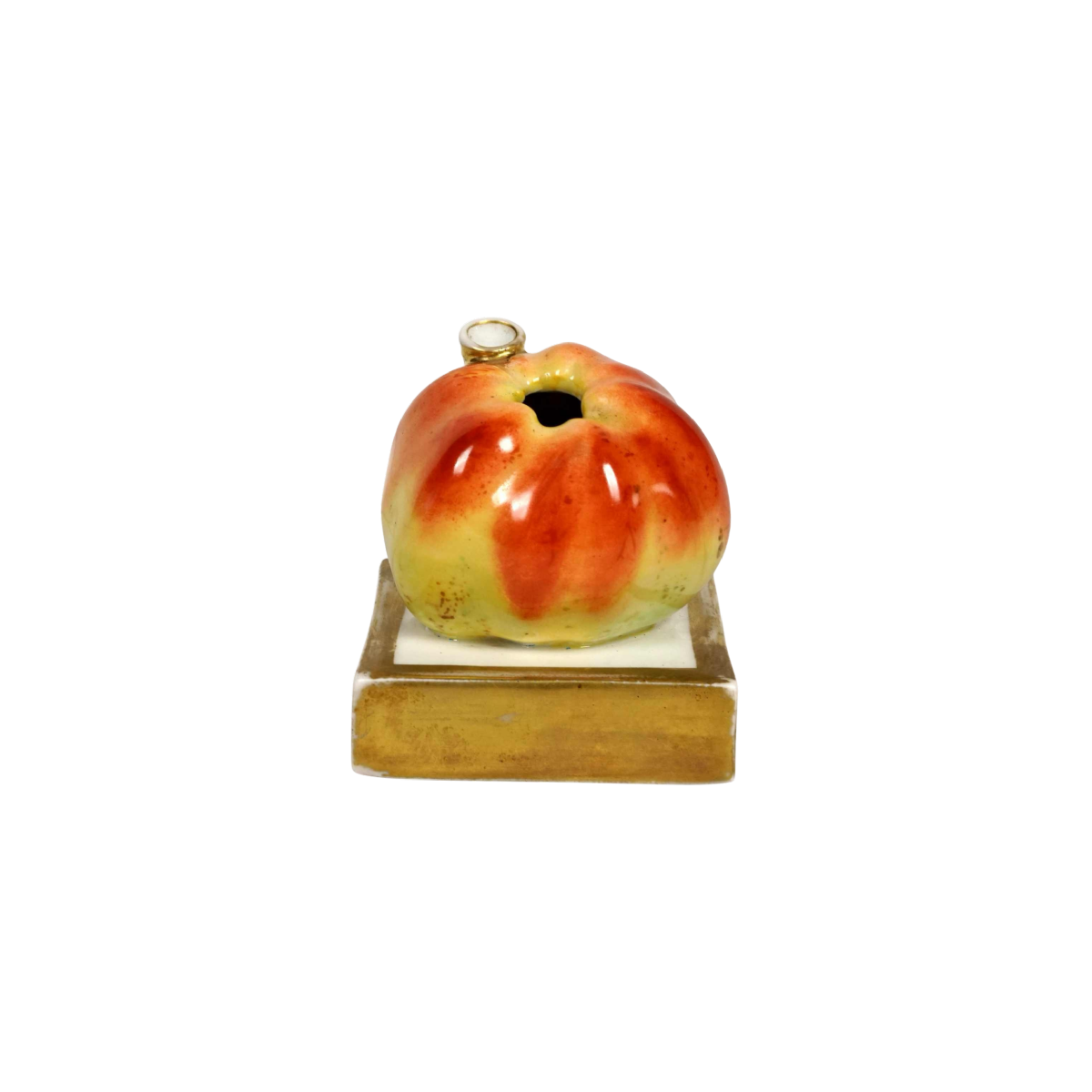 Polychrome en forme d'une pomme reposant sur une base carrée. Filets or en bordures.