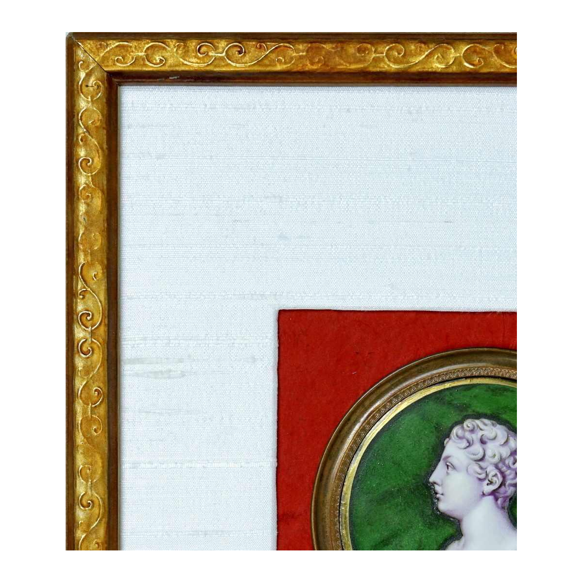 Ce médaillon est très intéressant par l'originalité de son décor, mais surtout de son fond à l'imitation d'une couleur rarissime sur porcelaine, la malachite, pourtant utilisée depuis l'antiquité, mais extrêmement difficile à réaliser sur porcelaine. Autre élément rare et intéressant, la représentation du ROI de ROME, qui lui aussi se trouve très rarement sur porcelaine ou biscuit.