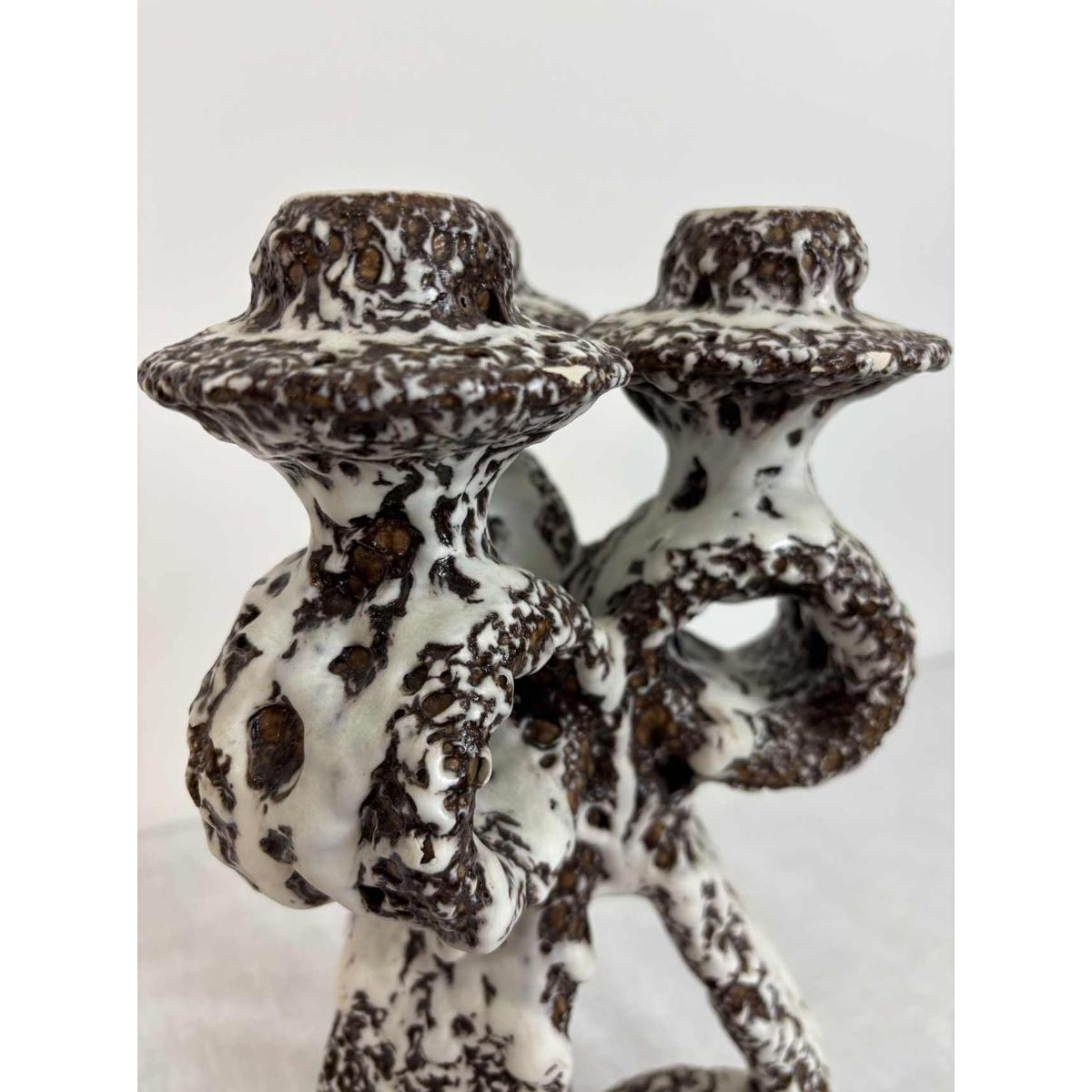 Grand candélabre à trois lumières composé de trois enroulements finissant par des bobèches, en céramique à émaillage blanc alcalin sur brun foncé.