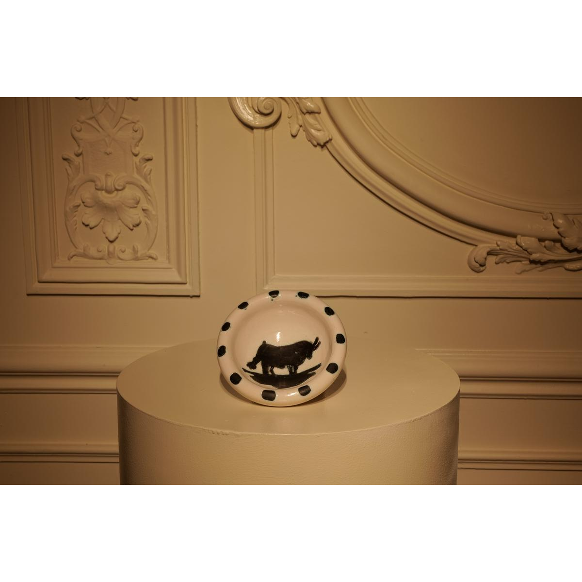 Pablo Picasso (1881–1973) Cendrier en céramique émaillée, Vallauris Décor au pinceau, noir sur fond crème. Ce cendrier en céramique émaillée témoigne du travail que Picasso réalise à Vallauris dans les années 1950, période durant laquelle il réinvente les formes utilitaires en véritables œuvres d’art. Au centre, le décor représente la silhouette d’un taureau, thème emblématique de l’artiste, associé à ses racines espagnoles et à l’imaginaire tauromachique qui traverse toute son œuvre. La figure, peinte d’un geste rapide et sûr, apparaît en aplats noirs presque calligraphiques, comme un signe essentiel réduit à sa force primitive. Le pourtour du cendrier est orné d’une série de pois noirs appliqués à la main, créant un rythme graphique simple et direct, typique des pièces de Vallauris. La palette volontairement restreinte, noir sur fond crème, met en valeur la spontanéité du trait et accentue le contraste entre forme et décor.