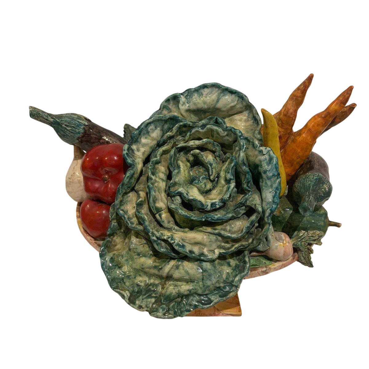Coupe de fruits et légumes en faïence barbotine.