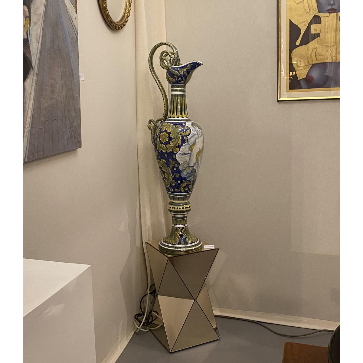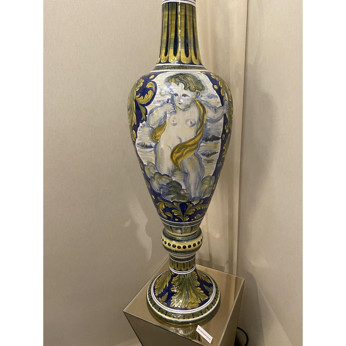 Très belle jarre en céramique signée Grifo Deruta* et numérotée 121/110. L'anse est formée de deux serpents délicatement enroulés. Un médaillon central orné d'un chérubin orne l'avant. La jarre est peinte dans les tons caractéristiques de blanc, vert, jaune et bleu.