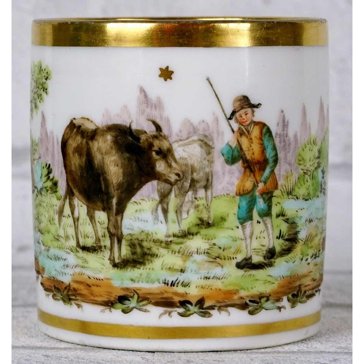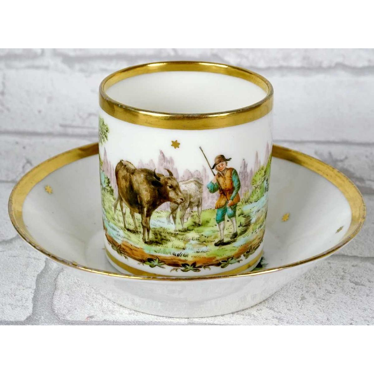 Récipient individuel pour boire des liquides généralement chauds. La tasse se présente avec une anse latérale verticale arrondie à «virgule. Elle est de forme cylindrique avec un fond plat reposant sur un léger talon. Sa soucoupe assortie est également à fond plat reposant sur un léger talon et à haut bord incliné. Le nom de tasse "litron" a été donné par la Manufacture de Vincennes vers 1752. Elle s'est inspirée de la choppe pour réaliser ce modèle. Les tasses et soucoupes apparaissent en série dès le début du XVIIIe siècle. Porcelaine DURE. Fond blanc à décor polychrome d'animaux de la ferme sur fond de paysage - Filets or en bordures.