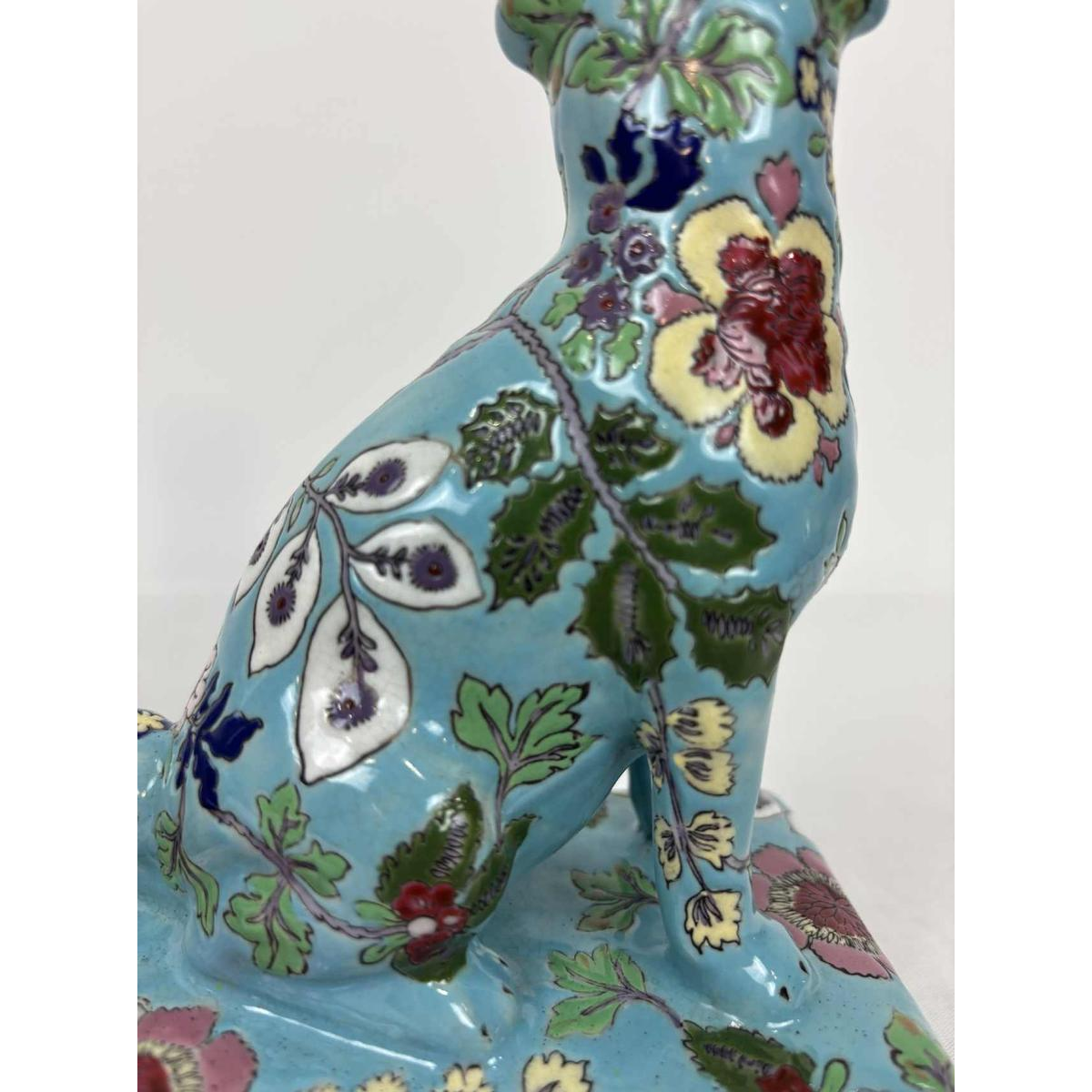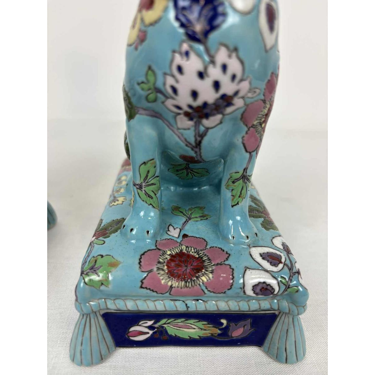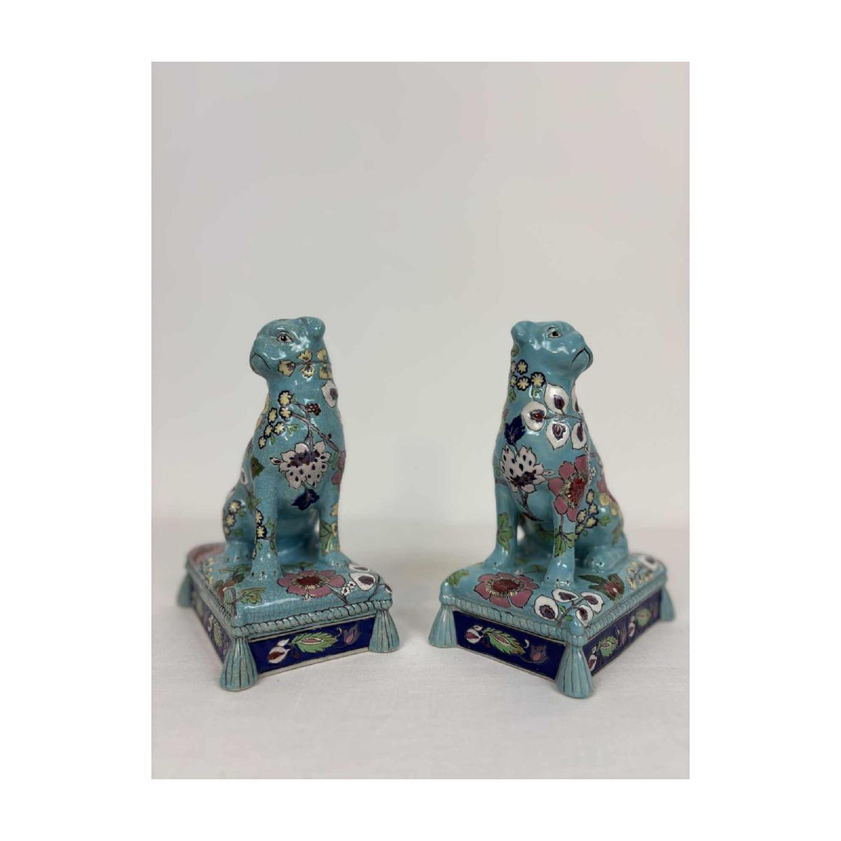 Ces figures animales aux allures de molosses stylisés arborent un fond turquoise caractéristique, rehaussé de motifs floraux finement cloisonés.