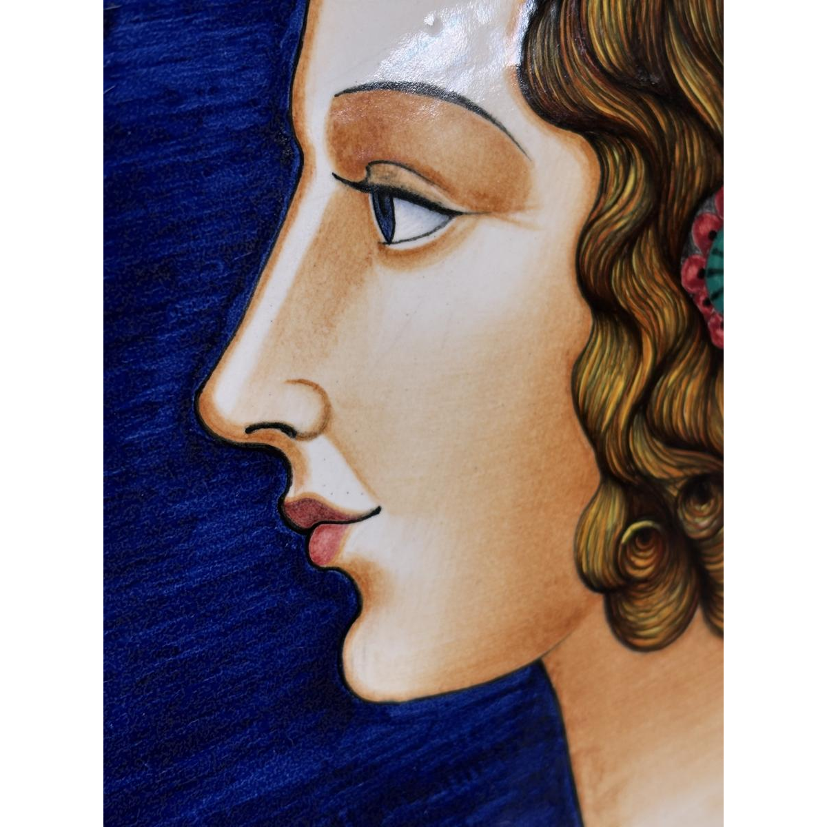 Le plat représente un profil féminin à la manière des "Bella donna" de la Renaissance italienne. Le portrait d'une grande finesse de traits se détache sur un fond bleu profond.