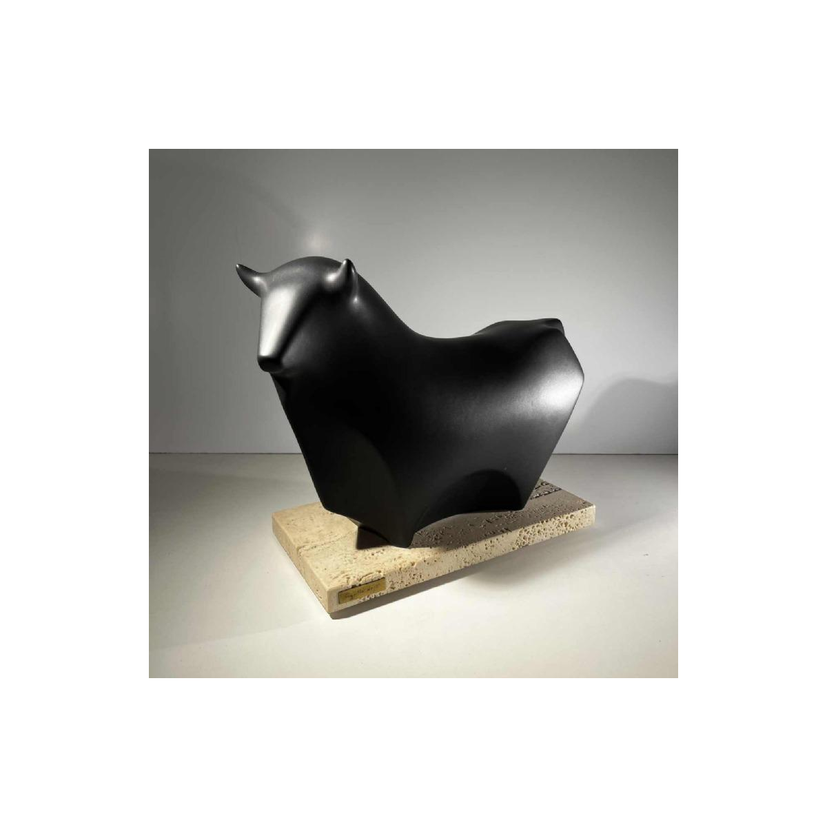 Vicente Agullo / Porta Celi, sculpture taureau / bizon noir, céramique porcelaine, socle travertin, ca 1970