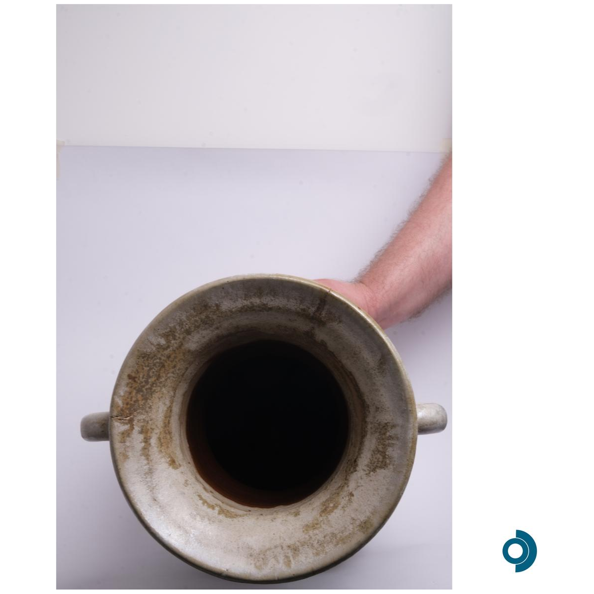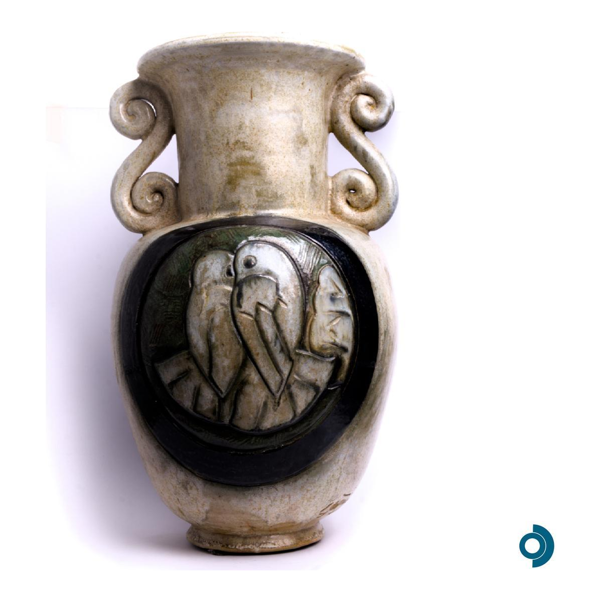 Roger GUERIN (1896 - 1954), vase en grès à décor d’oiseaux, 1946, grès tourné, taillé et émaillé / cuisson au sel, H : 45 cm. Pièce unique, signée et datée en creux sous la base + côté. Signature n° 17 répertoriée dans : Fauconnier M. & Migeot JC, Sel et Feu, les grès d’art de Bouffioulx et de Châtelet de 1900 à 1960, Bouffioulx, Le vieux Châtelet, 1995.