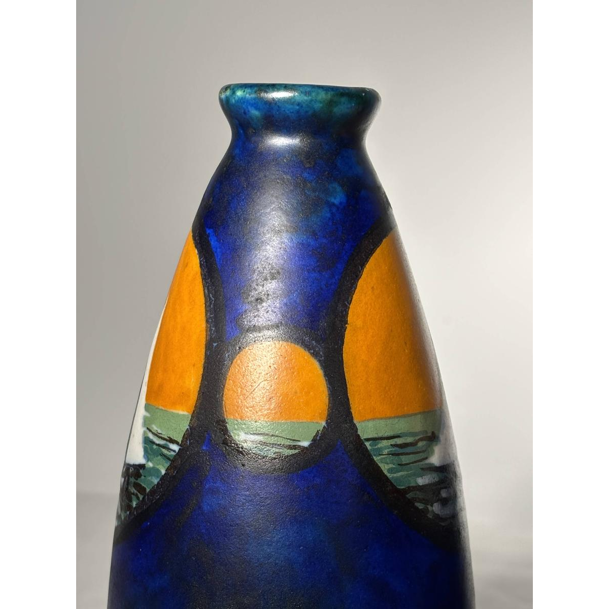 Elégante paire de vases en céramique, signés Louis Dage. Le décor, peint à la main, représente une scène marine stylisée: voilier sur une mer verte, couchant orangé, encadré de larges cartouches circulaires noirs, sur fond bleu cobalt profond aux effets nuagés.