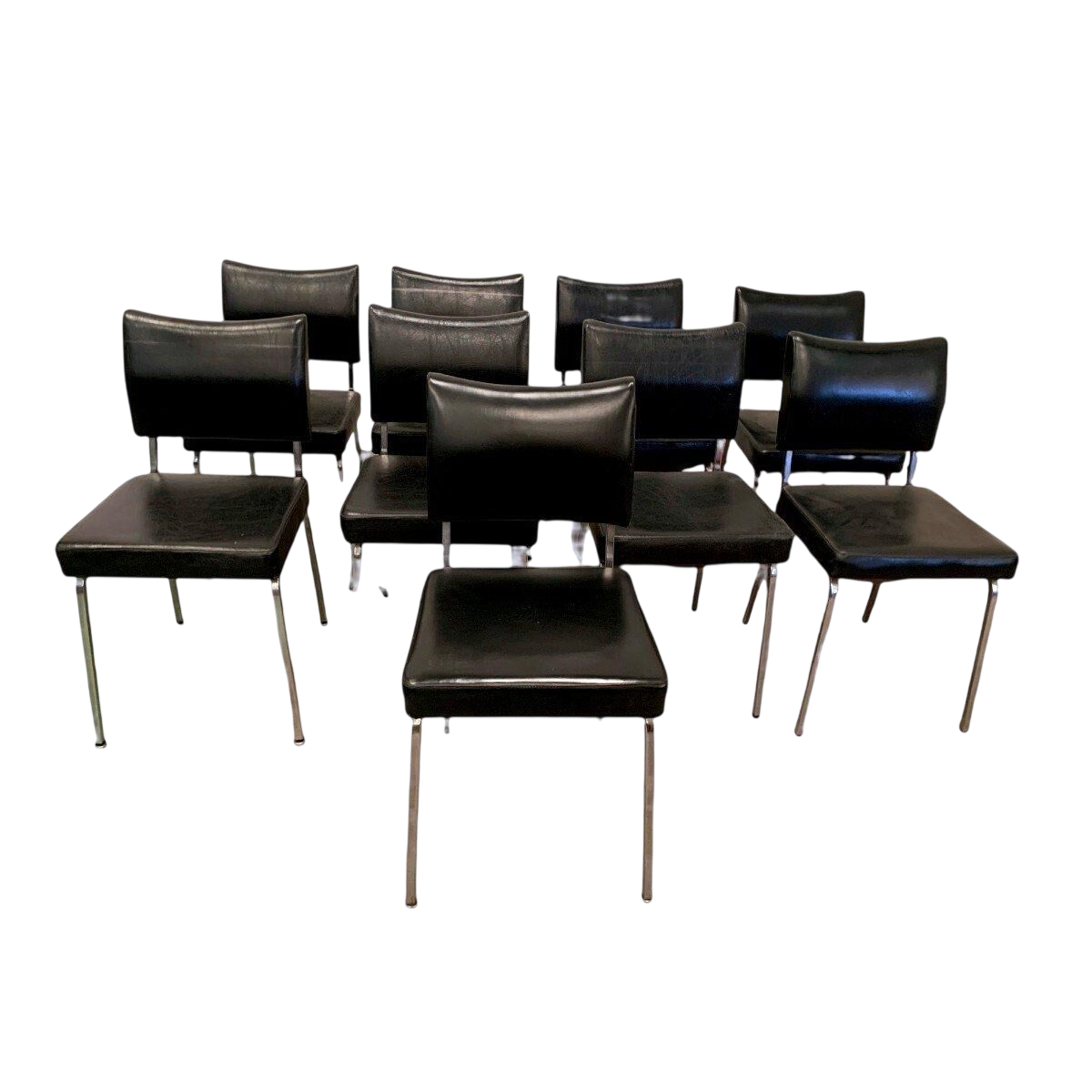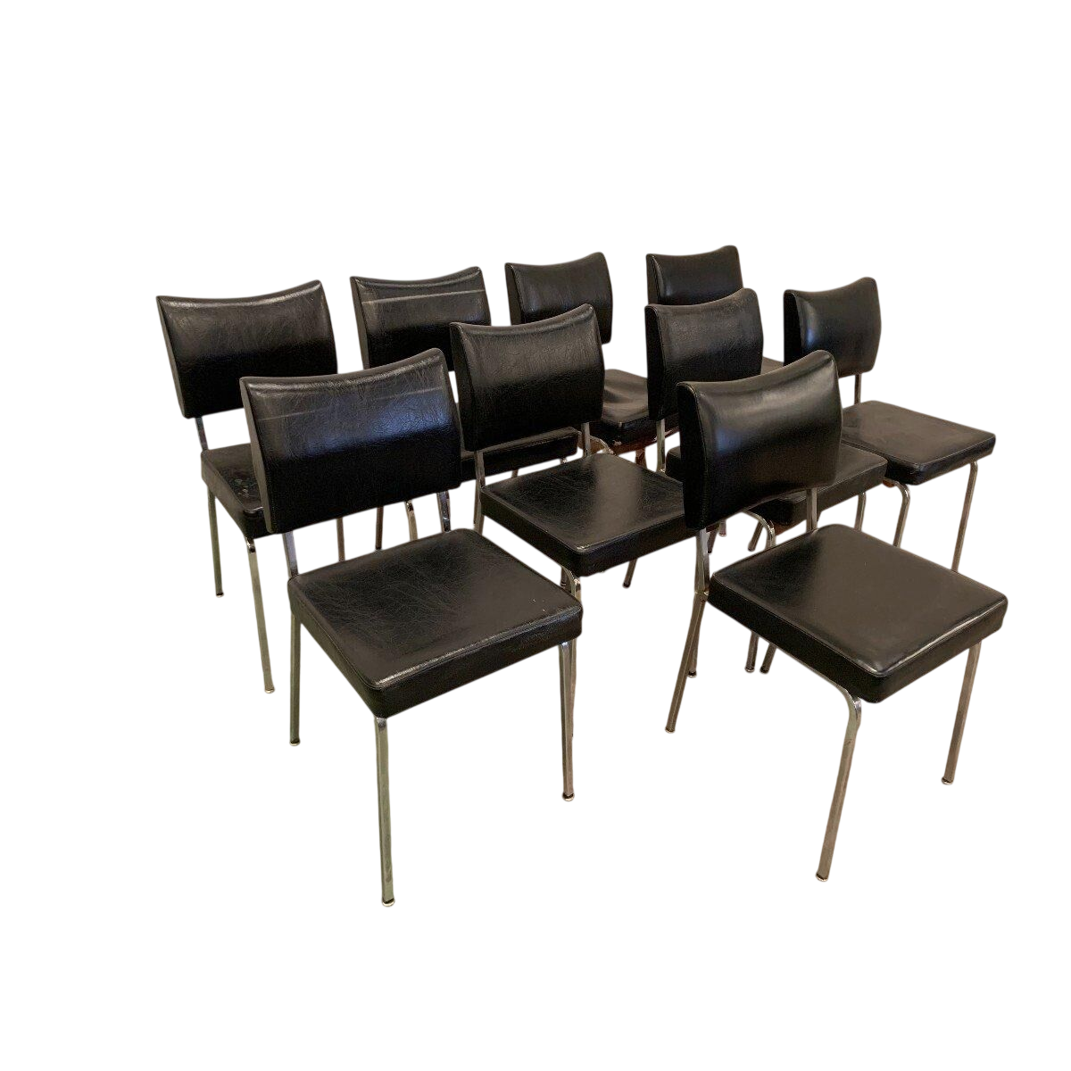 Ce formulaire permet uniquement de nous faire part d'un contenu illicite sur le produit : Suite de huit chaises vintage en chrome et simili cuir – XXᵉ siècle.