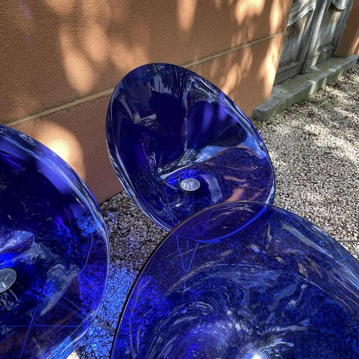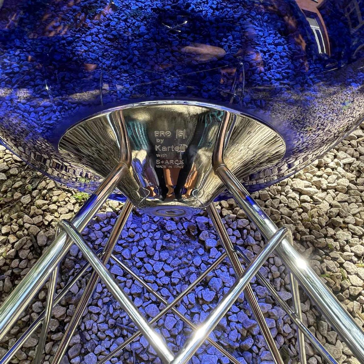Série de 6 chaises " ERO S" à piétement cathédrale en acier chromé, assise ovoïde en polycarbonate bleu créées par Philippe Starck , édition Kartell Italy en 1999.